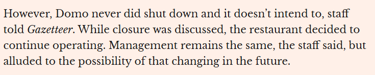 Is this from Yelp? Yelp doesn’t have any new reviews of Domo for the past two months. The red underline is for poster “Sasha Periera” who seems like a ringer because they only have “1 review.” Domo might be open now but how much business did they lose and who wants to spend $200 on a delicate item like sushi on a place that you don’t know whether it’s open or not. Several news sites contacted staff at Domo after the closing sign was posted and even they didn’t seem to know at that time what was going on.