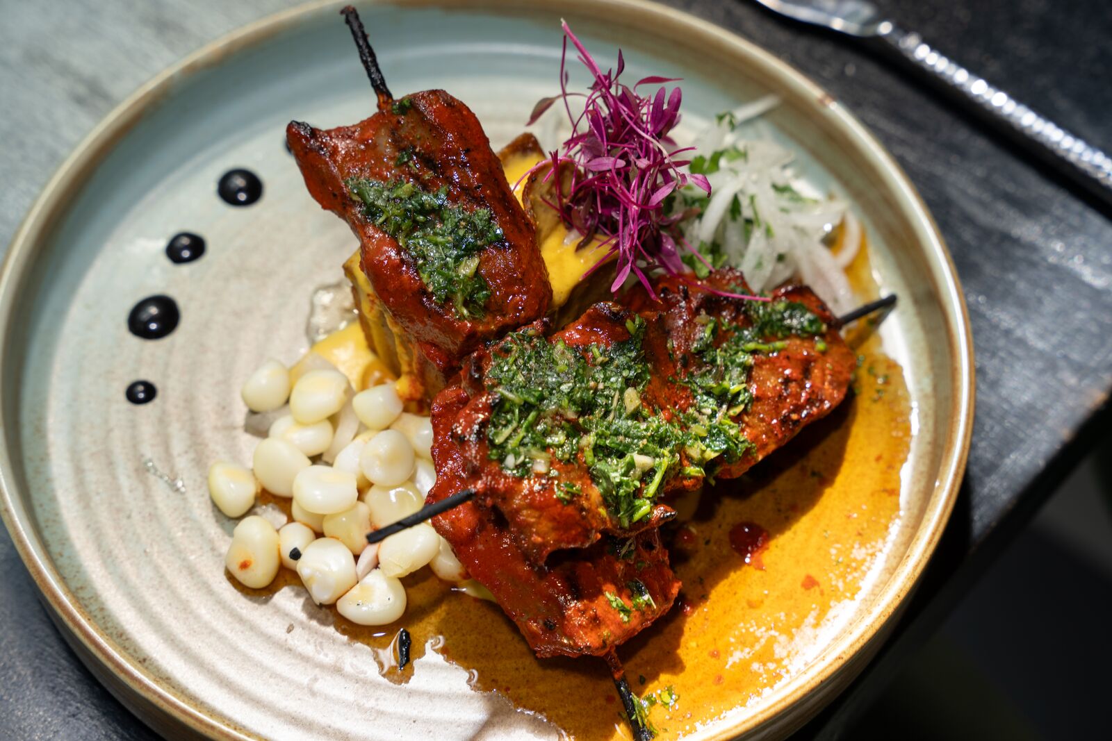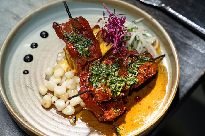 Anticuchos de Corazón: Classic Peruvian beef heart skewers with pavé potato and choclo