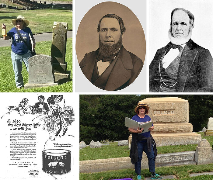 Left to right from top: Tour guide Barbara Gibson at the tomb of Leroy Napoleon “Jack” McQuesten; Chocolate entrepreneur Domingo Ghiradelli; Horticulturist Henderson Luelling (founder of Fruitvale); an early Folgers Coffee ad; Gibson at Folger’s resting place.P hotos courtesy of Barbara Gibson. Public Domain via Wikipedia: