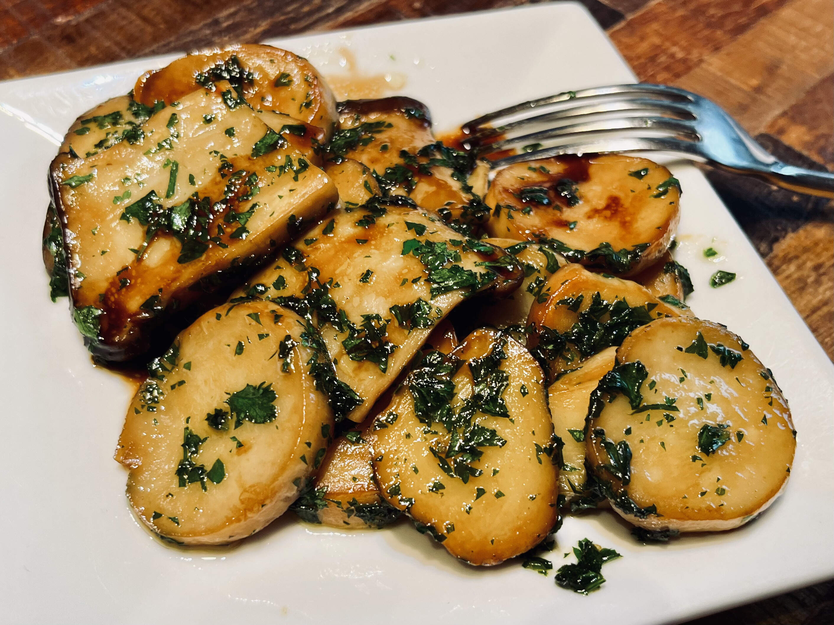 One big fat KOS sautéed in ghee, then steamed in its own juices after a shprinkling of Maldon salt. Added a tiny pat of butter to continue browning, splash of soy sauce, fresh parsley. A minuscule drop of pom balsamic just before serving.