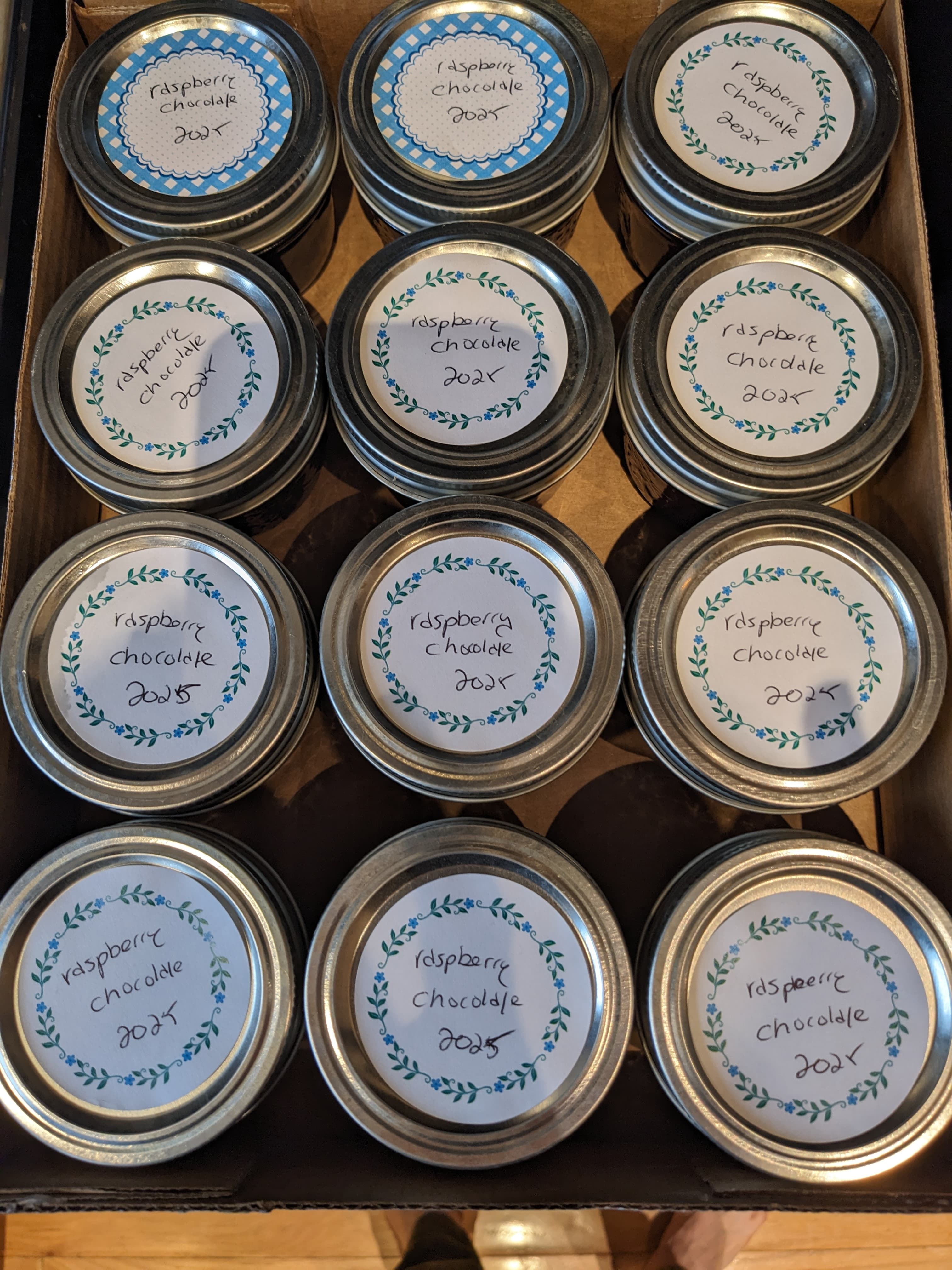 Made my annual batch of chocolate raspberry jam intended for staff gifts at Christmas: it’s a Christine Ferber recipe that I cheat and use frozen raspberries to make. I just realized that my picture shows only the lids ![]()