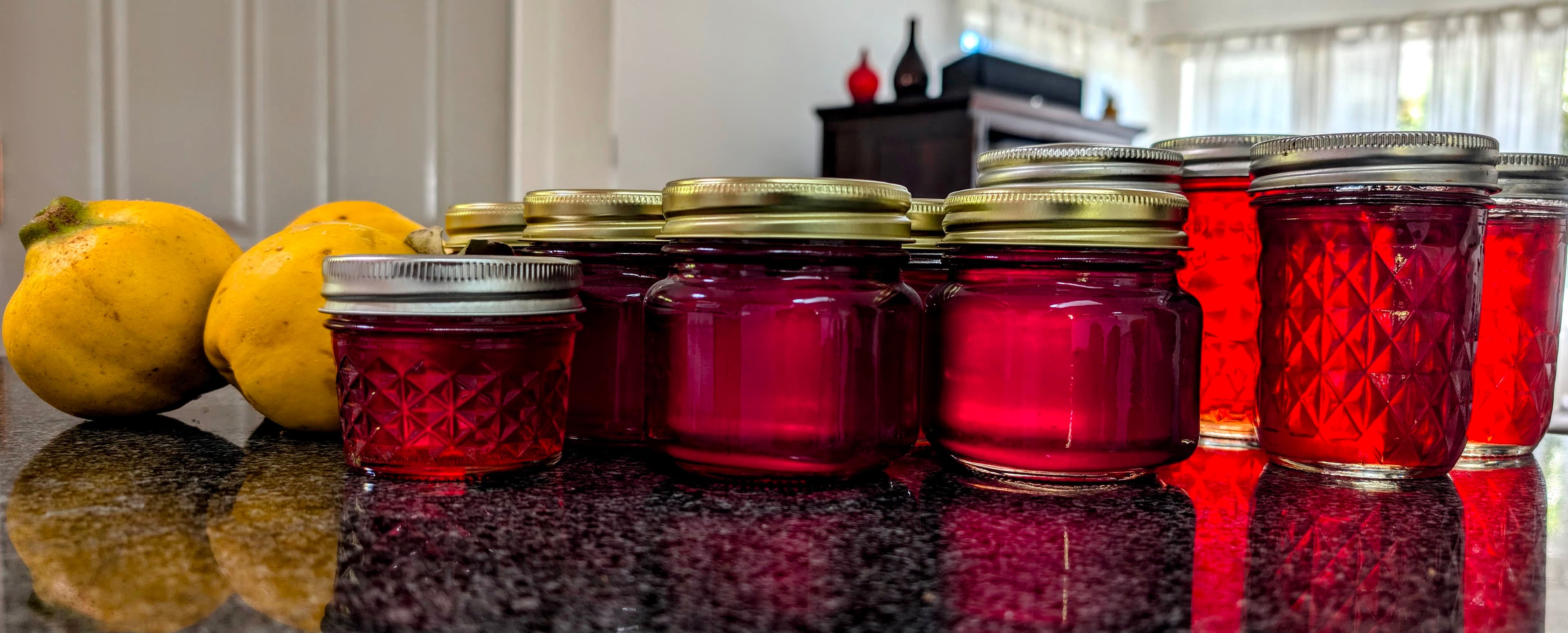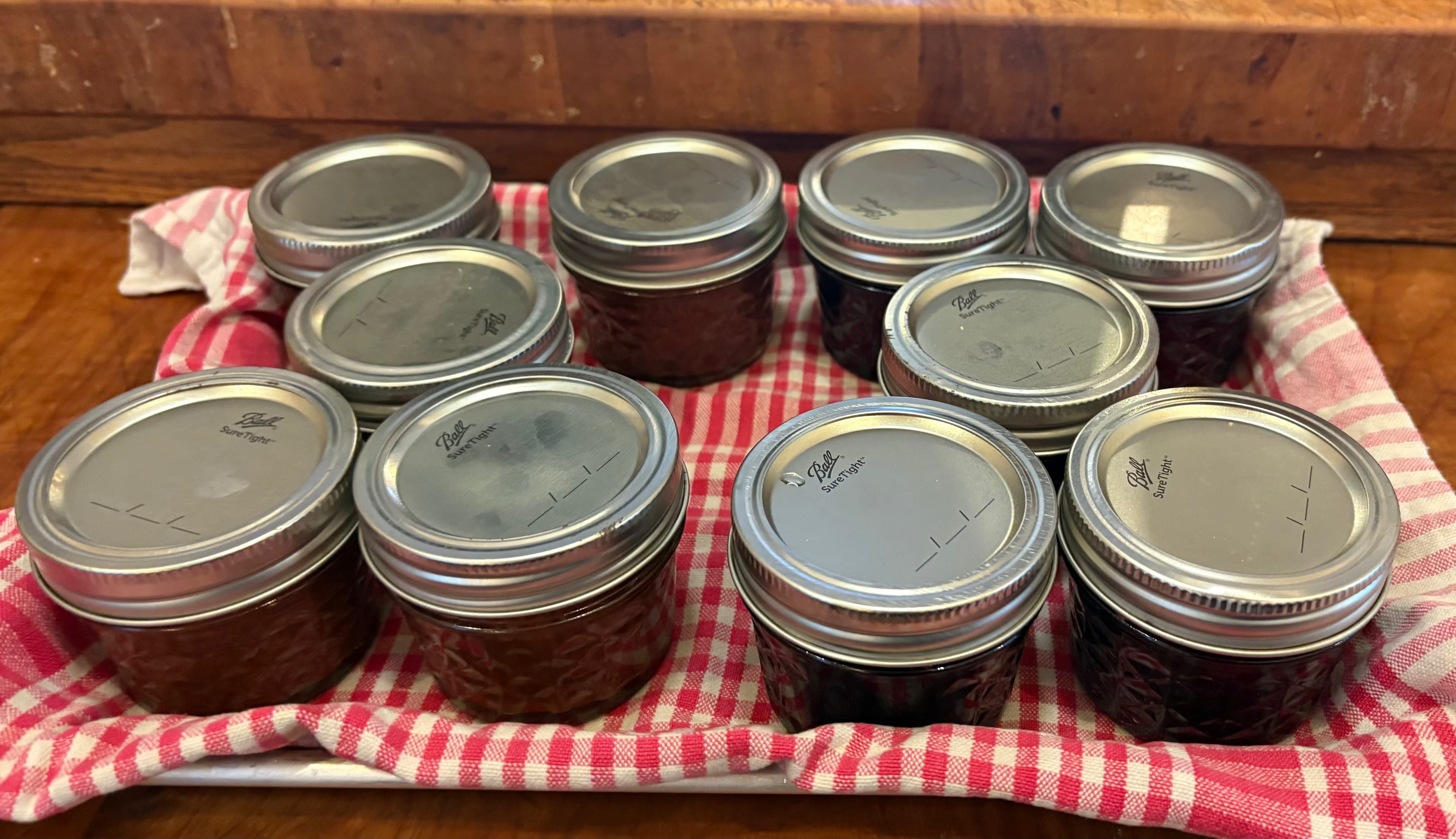 A few micro batches are my canning this year. Half a 5-pound bag of Gravensteins became spiced apple butter, enough for five 4-ounce jars. The other half became a couple of cups of (unsweetened, unspiced) applesauce, which I will process tomorrow. The remaining five 4-ounce jars in the photo are blueberry-lavender jam, made from 500g blueberries with 35% sugar, plus lavender “tea” (1 T. dried lavender steeped in 2 T. hot water for 15 min. and strained) and lemon juice. Little bit extra of each is in jars inn the fridge.
