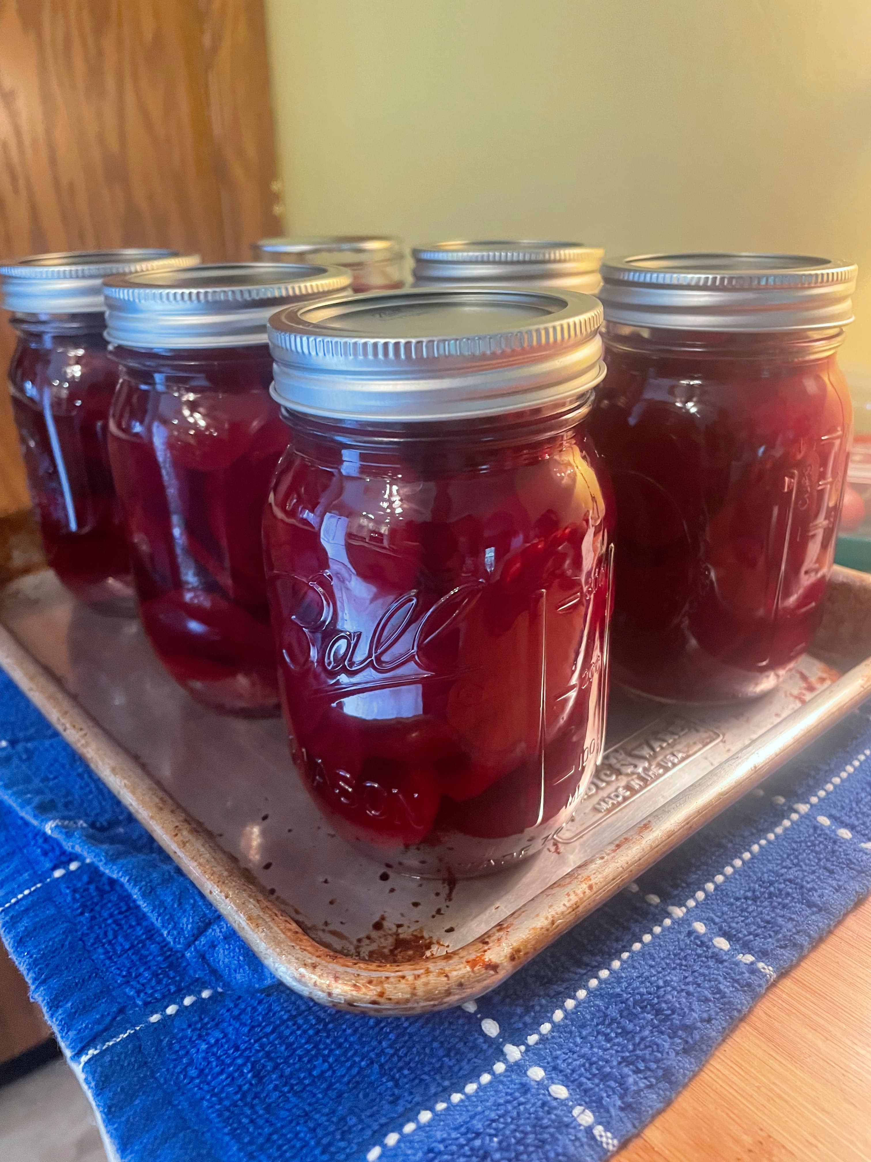 I boiled them whole in three pots - one for the XL beets, one for M-L, and one for the S ones. As they became fully tender, I plunged them a couple at a time into an ice bath, then removed the skins and sliced them. I’ve got a couple more of the XL ones to finish, then it’s on to mixing them with the vinegar, salt, water and spices, bringing that to a boil, and then hot-packing pint jars.