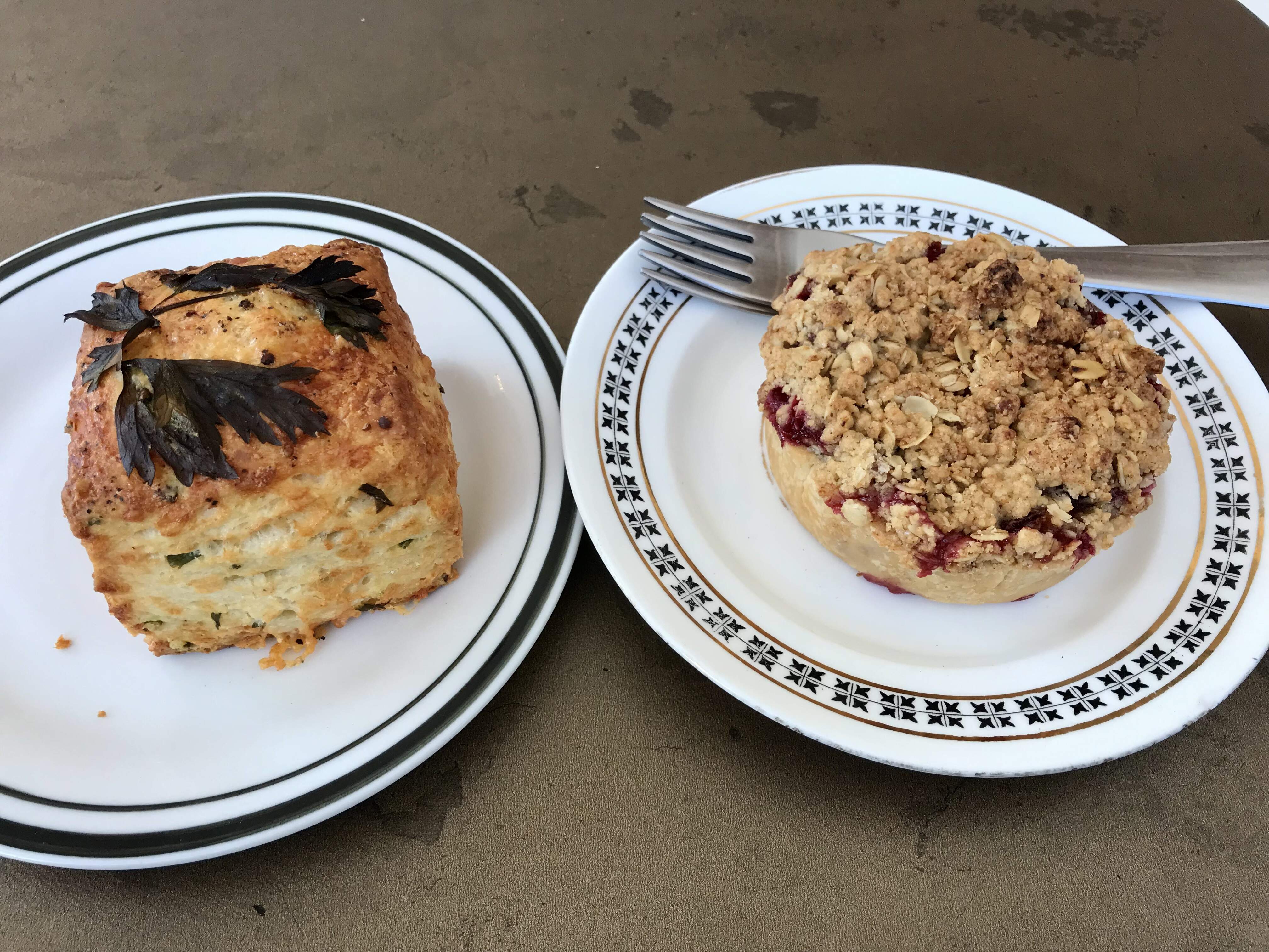 The cheddar chive scone had a crisp edge, cheesy interior, and a great fall-apart texture. The plum crumble was a tart that featured tangy Ontario plums and really let the fruit shine without too much sugar.