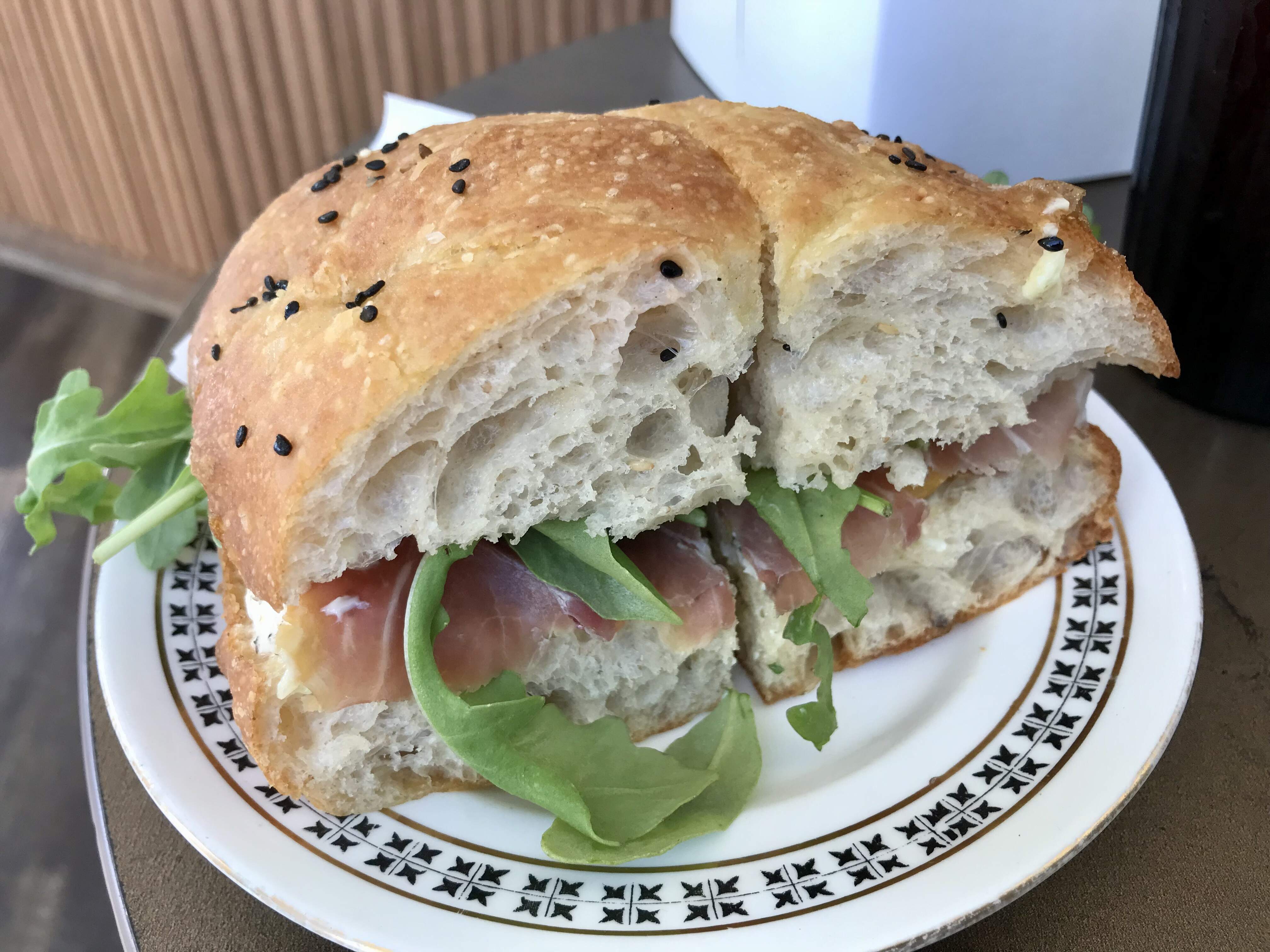 At 10:30, they start serving their daily sandwich. My version had heirloom tomatoes (from White Lily farm); fior de latte marinated in olive oil, pepper, thyme, and parsley; basil aioli; proscuitto; arugula; all on fluffy black sesame focaccia.