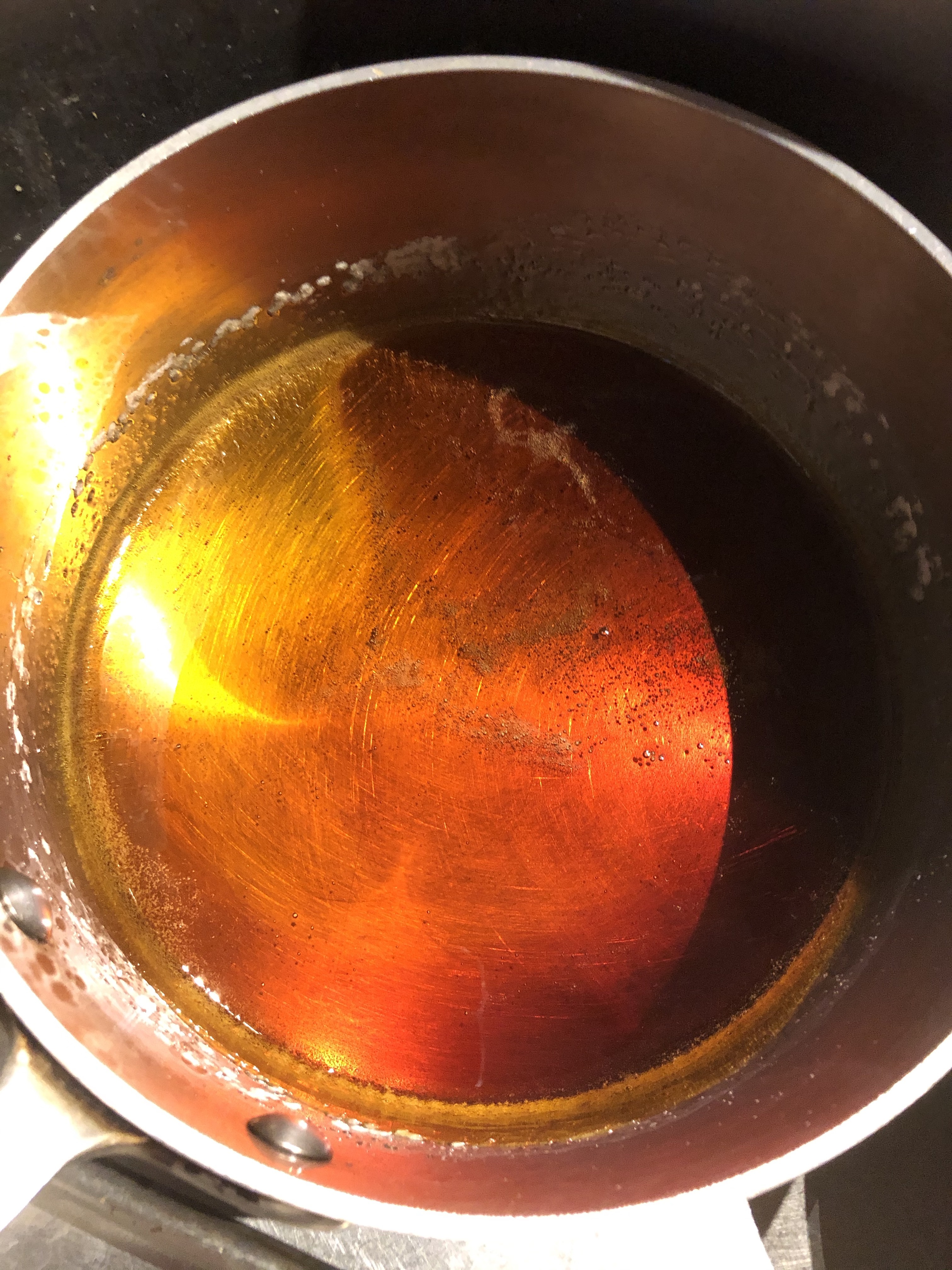5 Uncover the pan when big bubbles appear and continue boiling, swirling the pan slowly by its handle. In a number of seconds or minutes, the syrup will begin to color. Continue boiling and swirling a few seconds more, until it’s a light caramel brown, then remove from heat but continue swirling – it will darken more. If need to submerge the in the ice water bath to stop further cooking if needed… DO NOT USE ANY SPOON OR OTHER ITEM TO STIR . This technique is taken FROM Julia Child’s recipe for making caramel sauce .It is fool proof if one follows it.