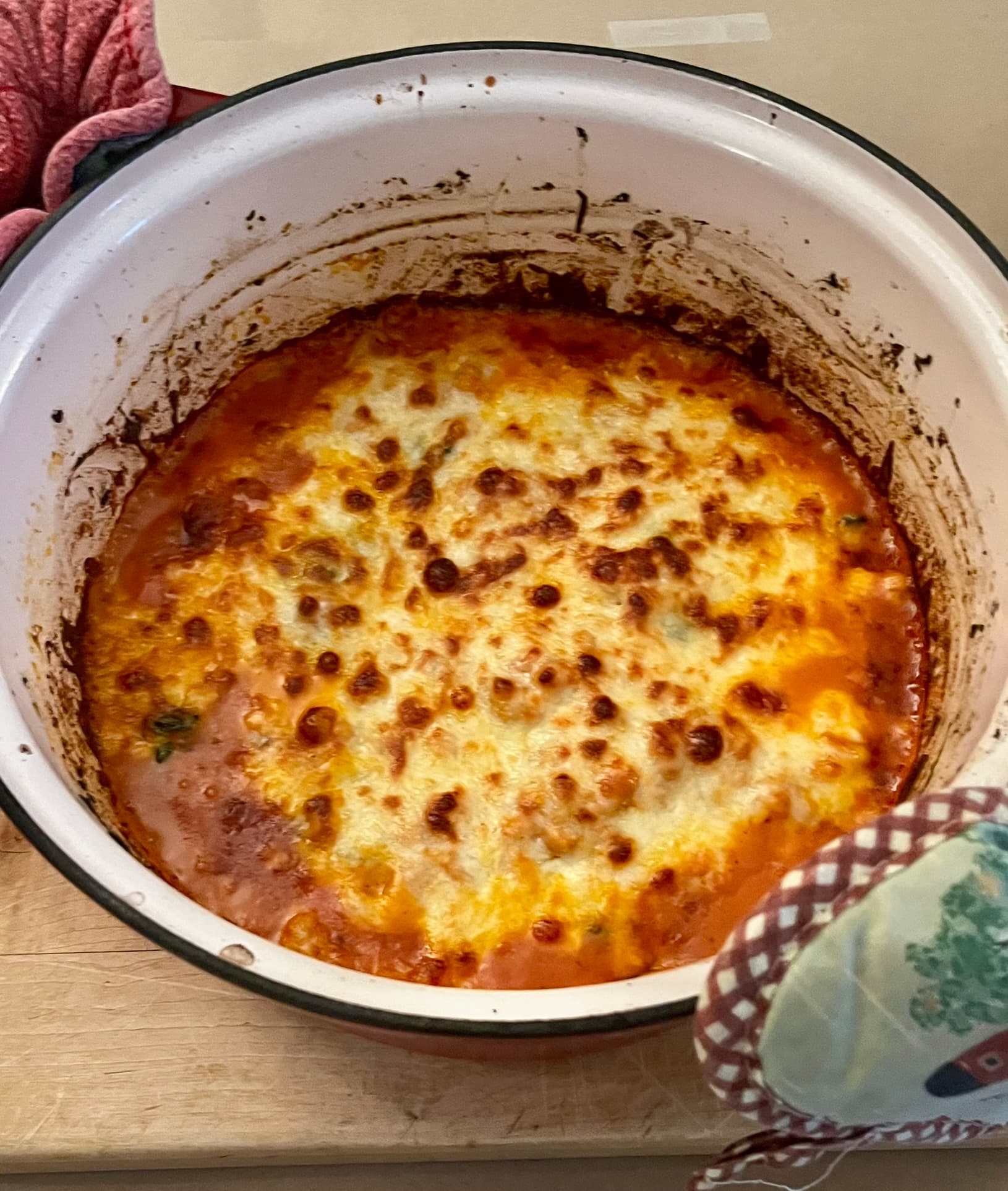 After soaking around 1.5 cups dried pintos overnight , I rinsed them, and put them in an ovenproof dish. oven preheated to 300 ⁰F. Covered them with water that was 2 or 3 inches deeper than the beans. Added 2 bay leaves, half a peeled onion, 2 Chiles de Arbol and one California Chile. 1 tsp dried epazote.