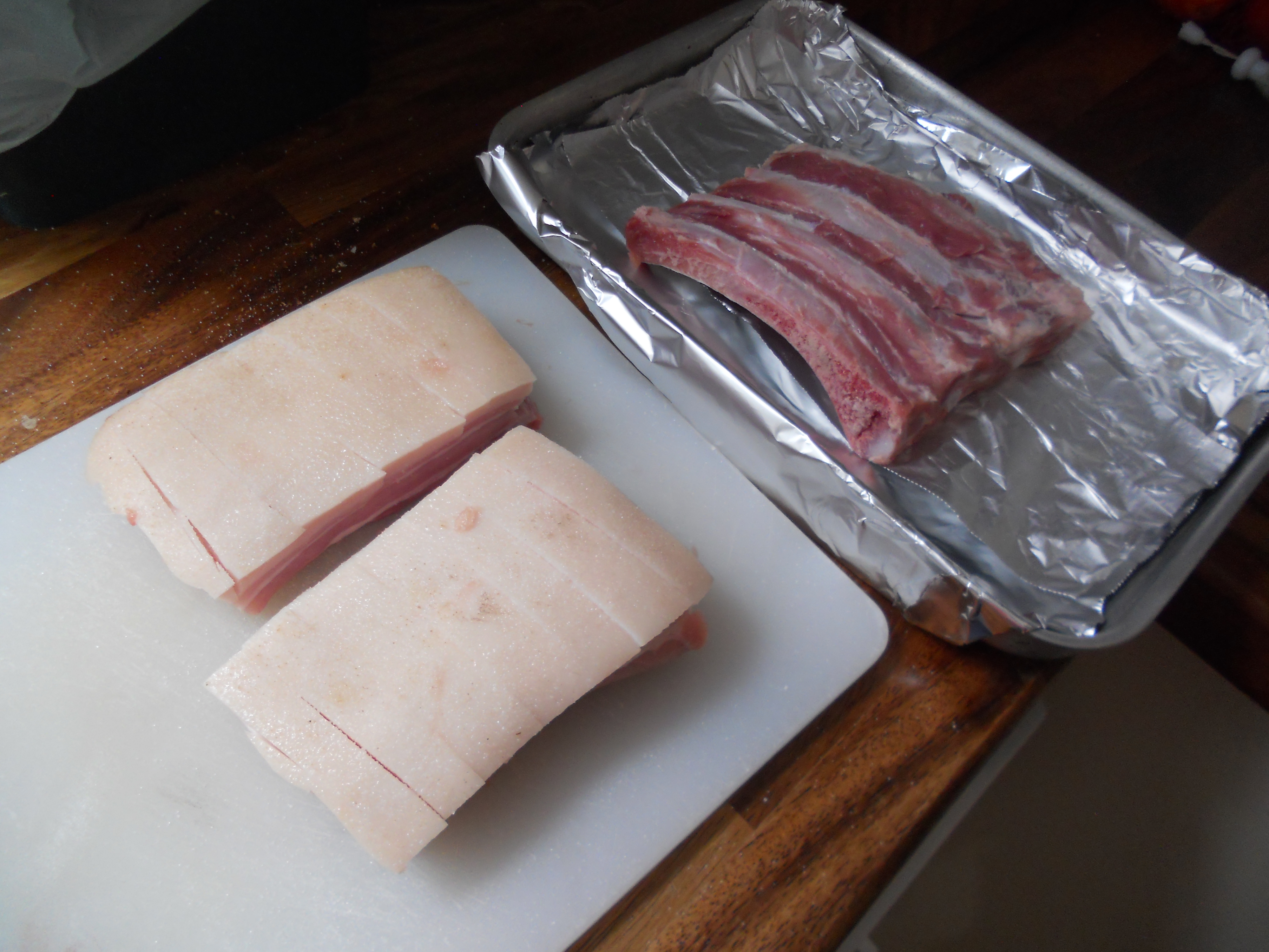My effort yesterday started with a 2lb bone-in slab, as that’s all my local supermarket had. Much more the side of the animal I’d guess, rather than the true belly.