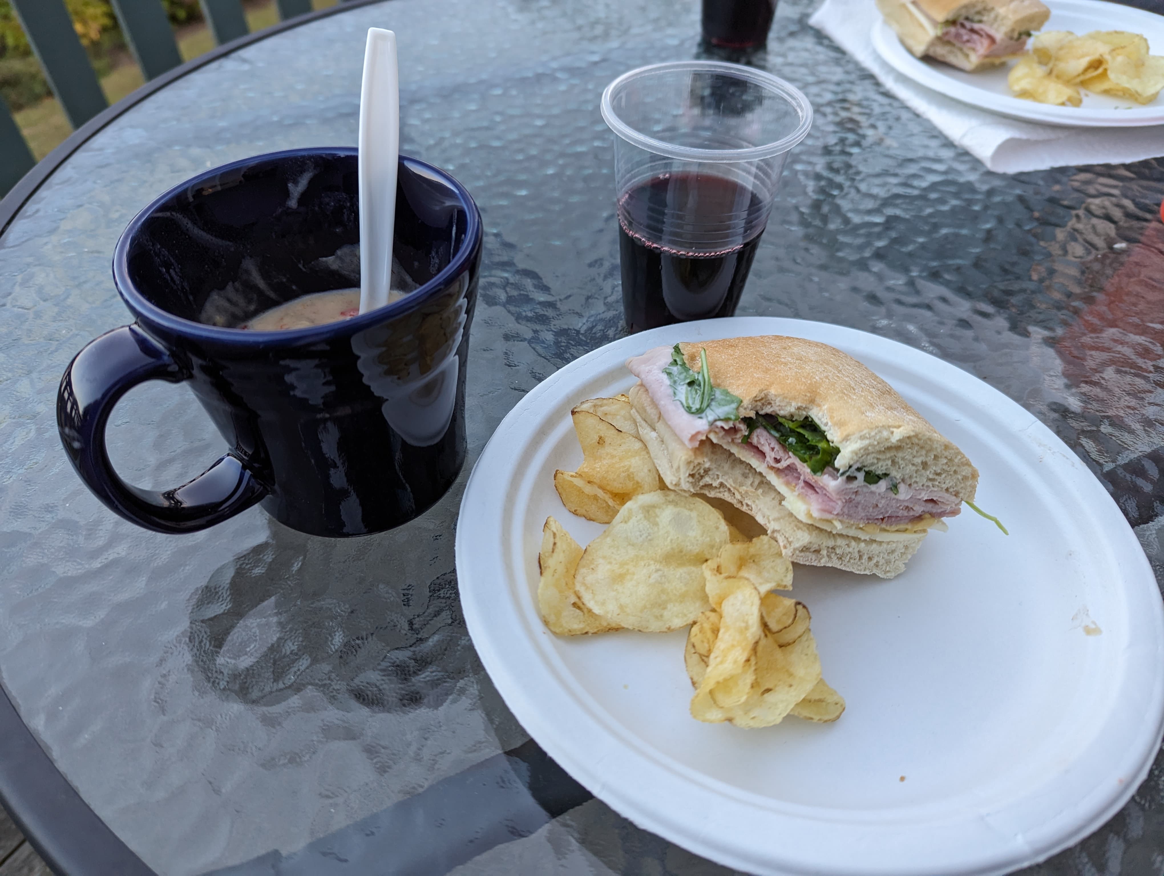 Traveled on Monday, stopped in Hyannis for a lunch at the Knack, clam roll, which had just the right amount of clams for me, a fish sandwich for DH, was big! House made pickles and a pretty good tartar sauce. We split the fries. Visited the Sparrow Coffee shop once we landed in Orleans, for a frozen hot chocolate and a slice of the lightest carrot cake I have ever had. We were not too hungry that evening and picked up some shrimp & corn chowder and a ham/cheese/arugula sandwich to share on the deck, watching the sunset.