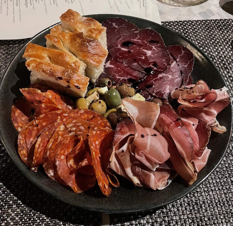 As we were eating the dip – which was very tasty – we realized we were hungrier than we’d thought, and decided to try a trio of cured meats. From the menu of around eight or nine choices we decided on soppressata, speck, and wagyu bresaola.
