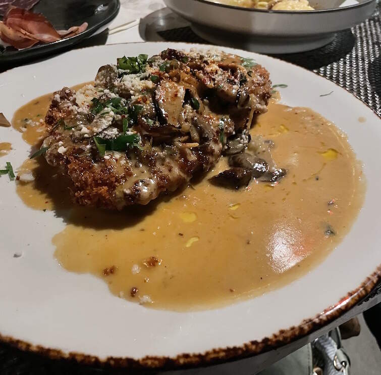 The tortelloni plate was split by the kitchen, so there would be six in a normal serving. In any case: this was really, really good. Rich, comforting, perfect. The chicken marsala was also excellent. Fried, which I was not expecting, and very crispy. Sauce well seasoned and flavorful. Really nicely done in both cases.