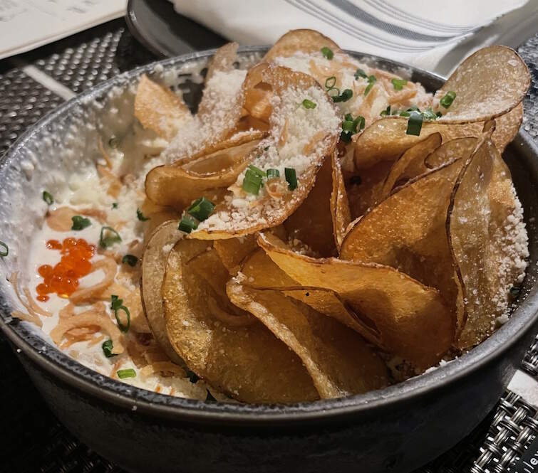 To go along with the drinks, onion dip with trout roe. (Two for two on roe – always a good start to the evening.)