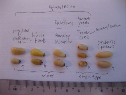 Whereas Korean/Chinese (et al) pine nuts are fat and stubby, and often more triangular in shape, sometimes with a brown tip: