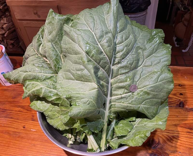 Run out of bananas, eh? Those collards are HUGE! One leaf per person, maybe!