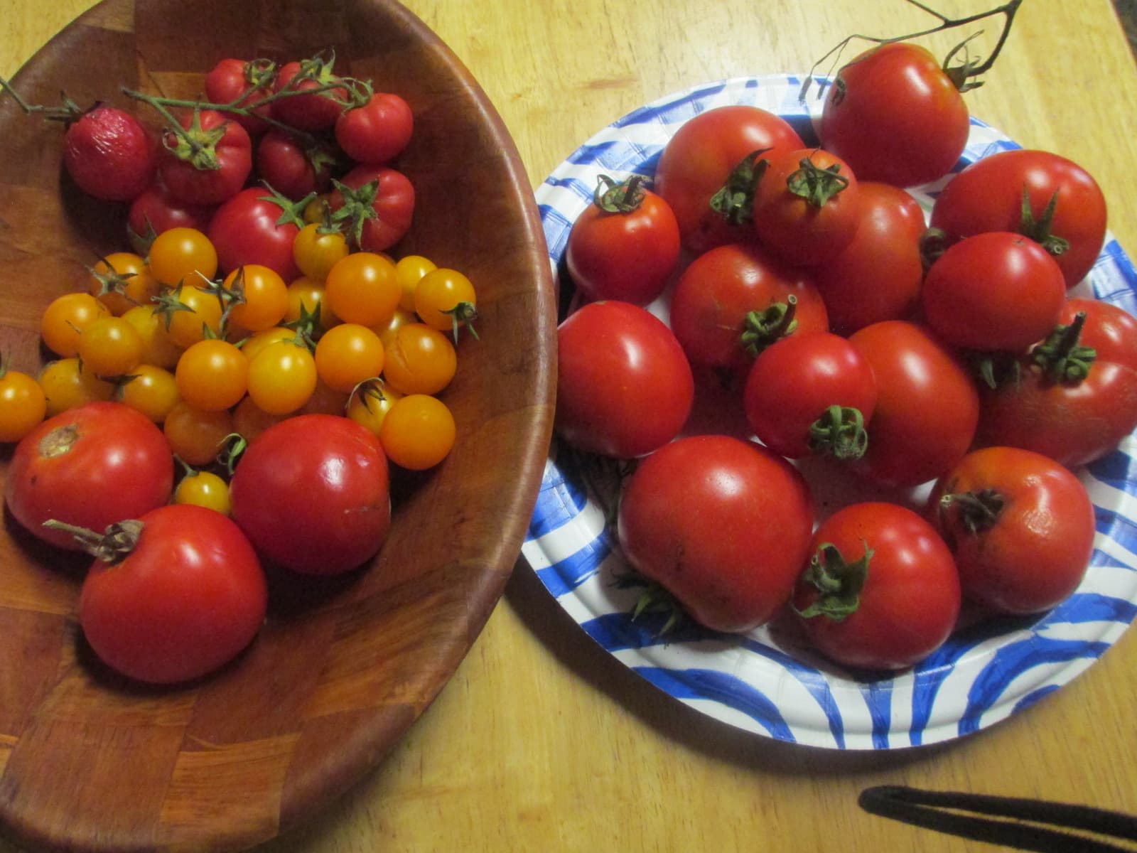 My latest pick. I have some Oregon Spring plants on the front and pack patio that didn’t get very big, but they are ripening. The ones on the paper plate are from the garden.