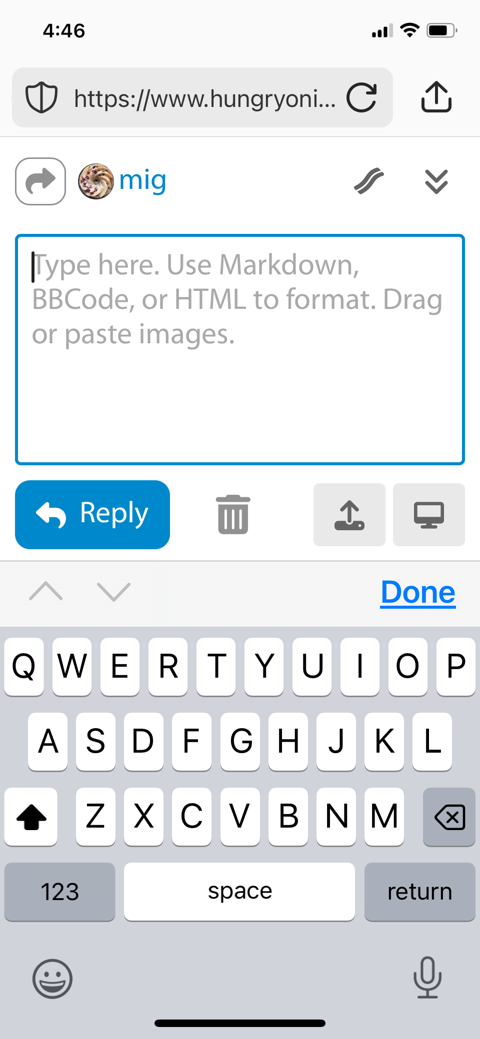 I went to the Discourse site and started a reply to a post there. The reply screen is normal, with the reply screen not getting bigger when I hit Done.