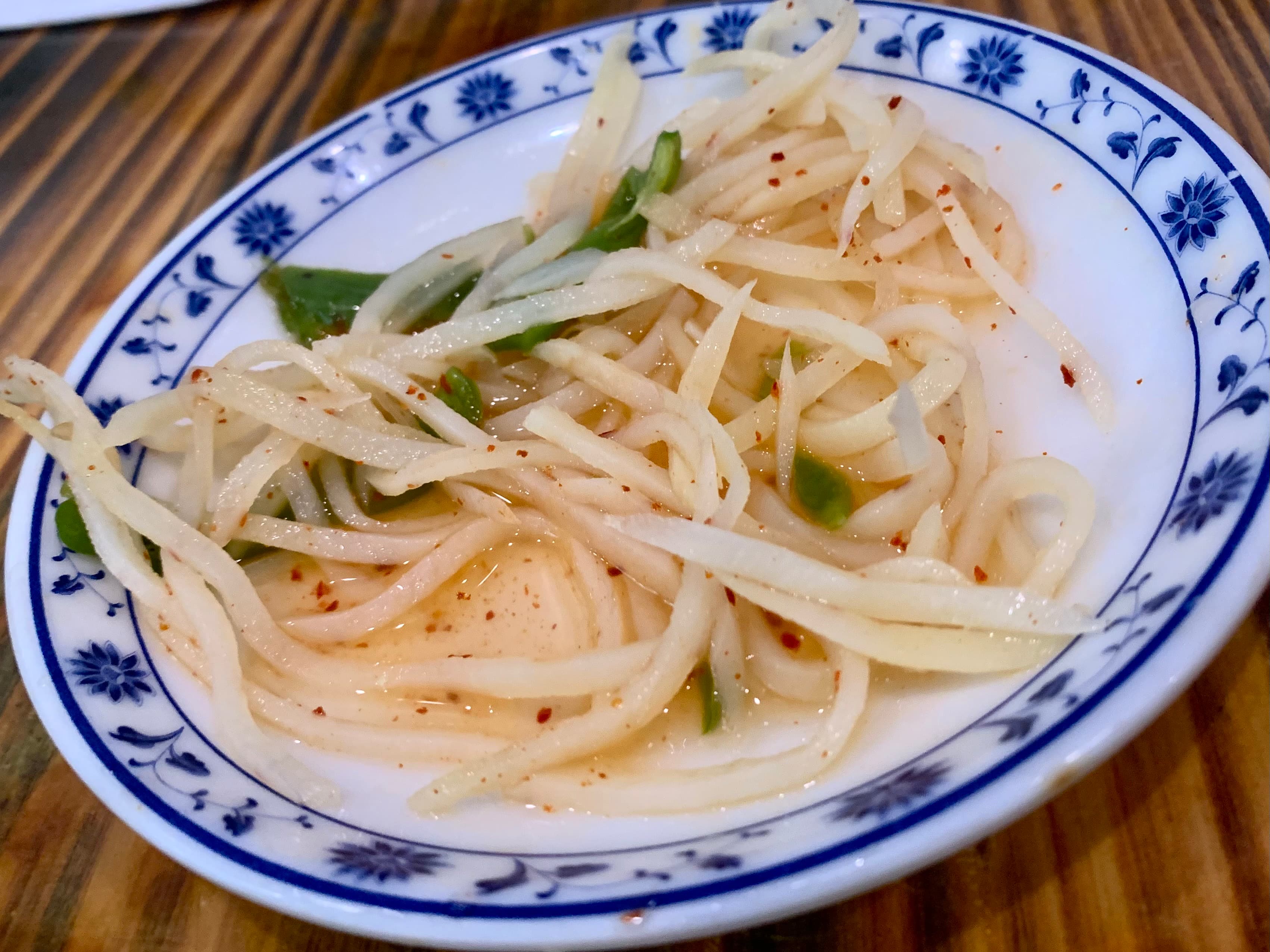 Complimentary snacks of shredded potato salad / pickle and shredded spicy cabbage salad / pickle.