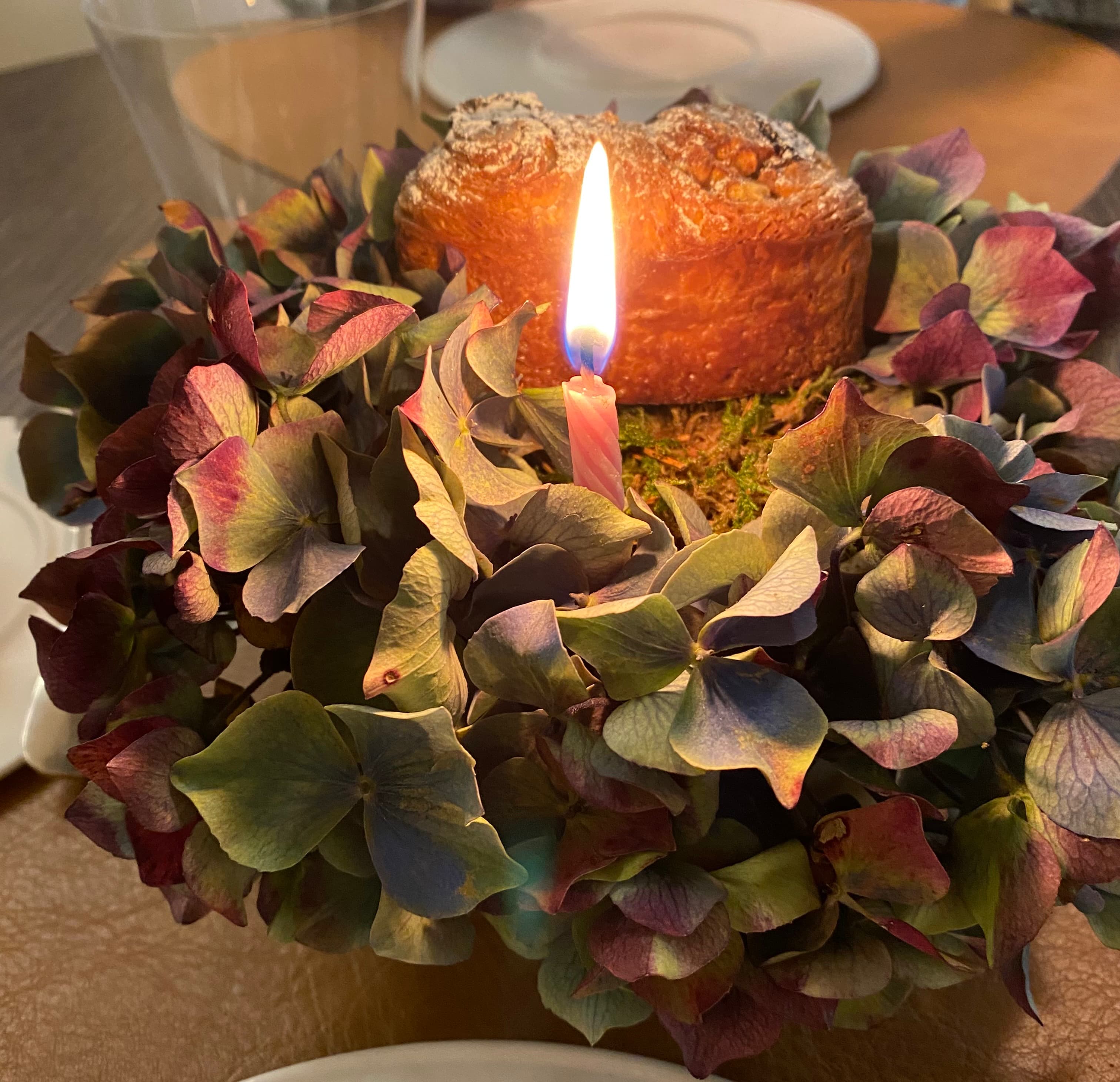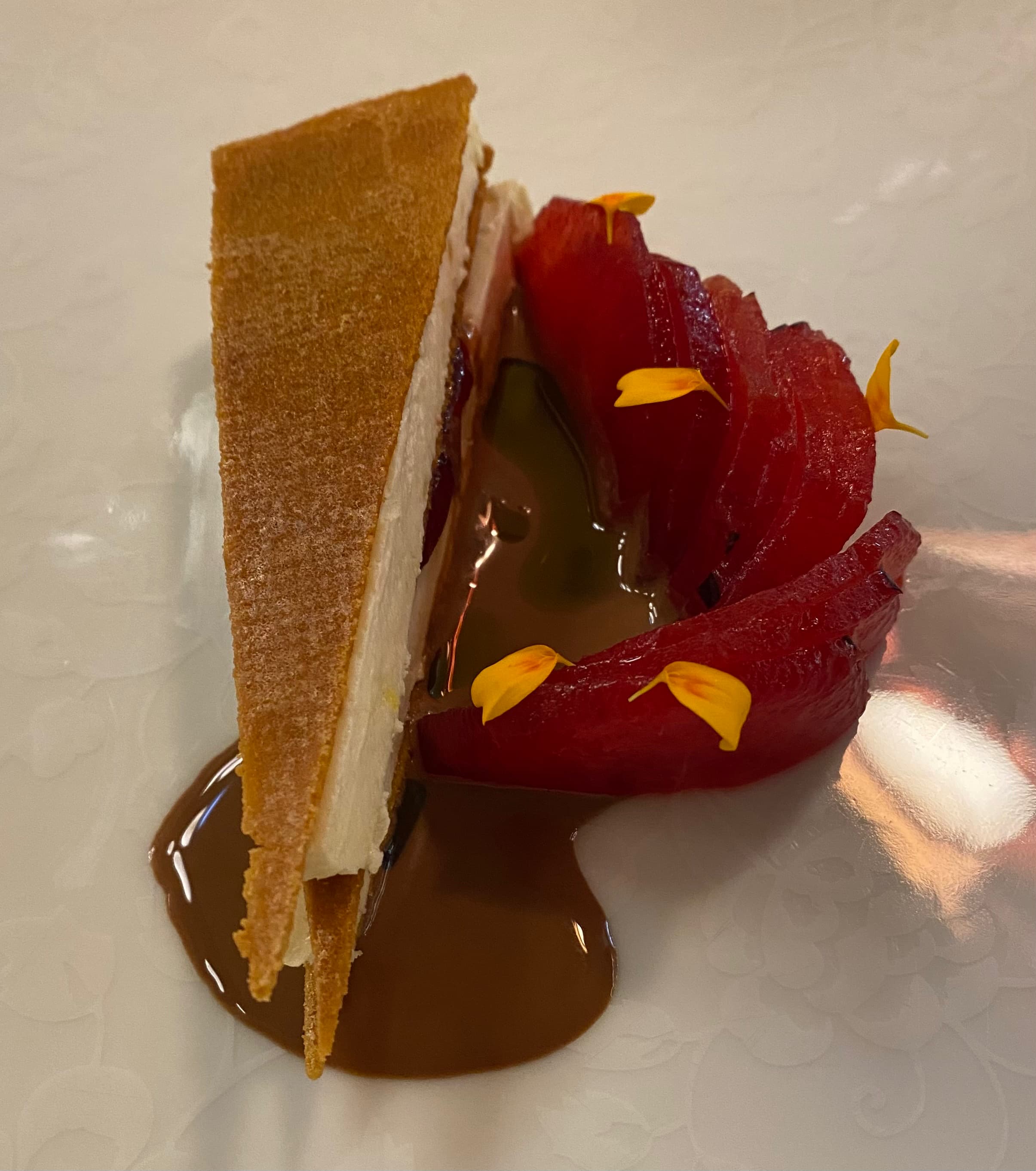 Light cream sandwiched between thin wafers, plums, chocolate and marigolds were on the dessert plate. I was excited to see a sauce spoon put out for dessert.