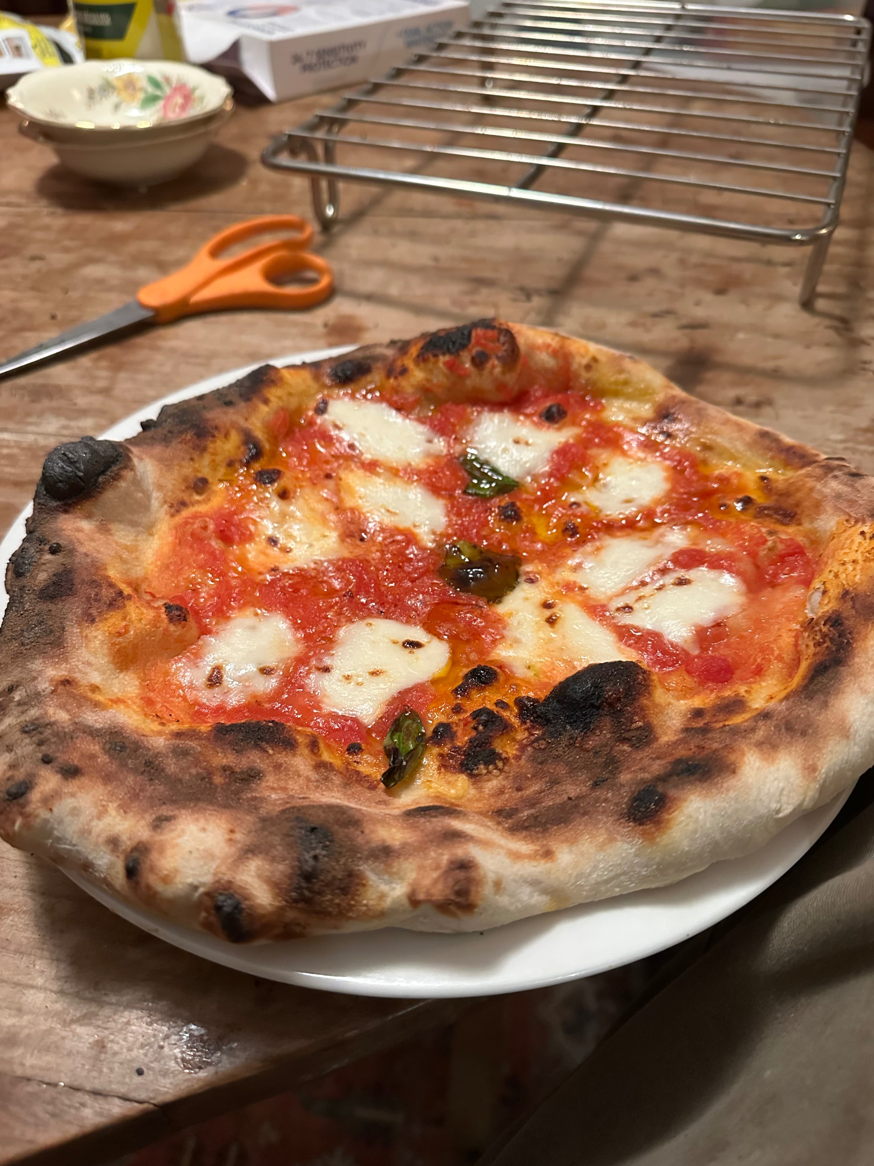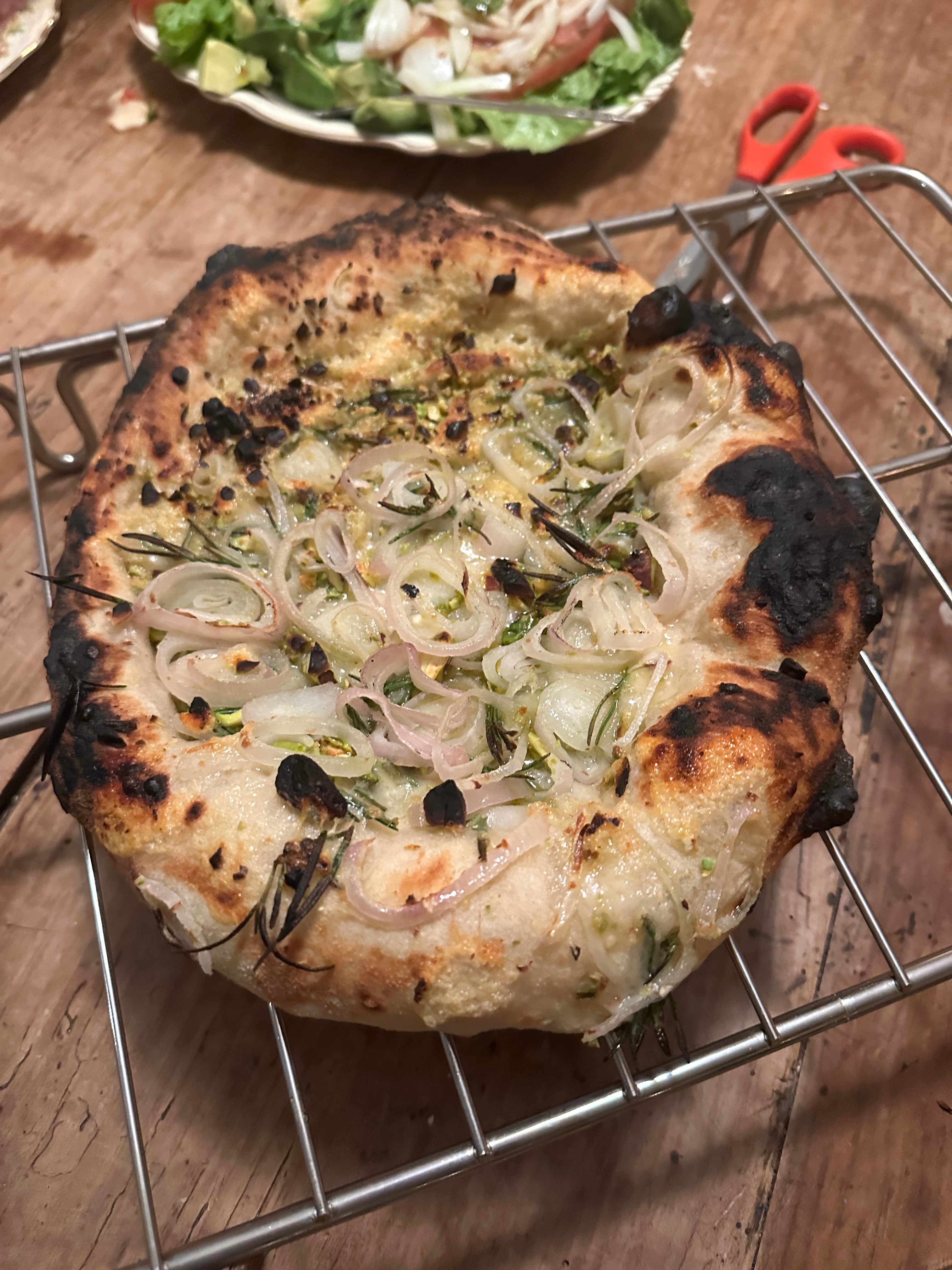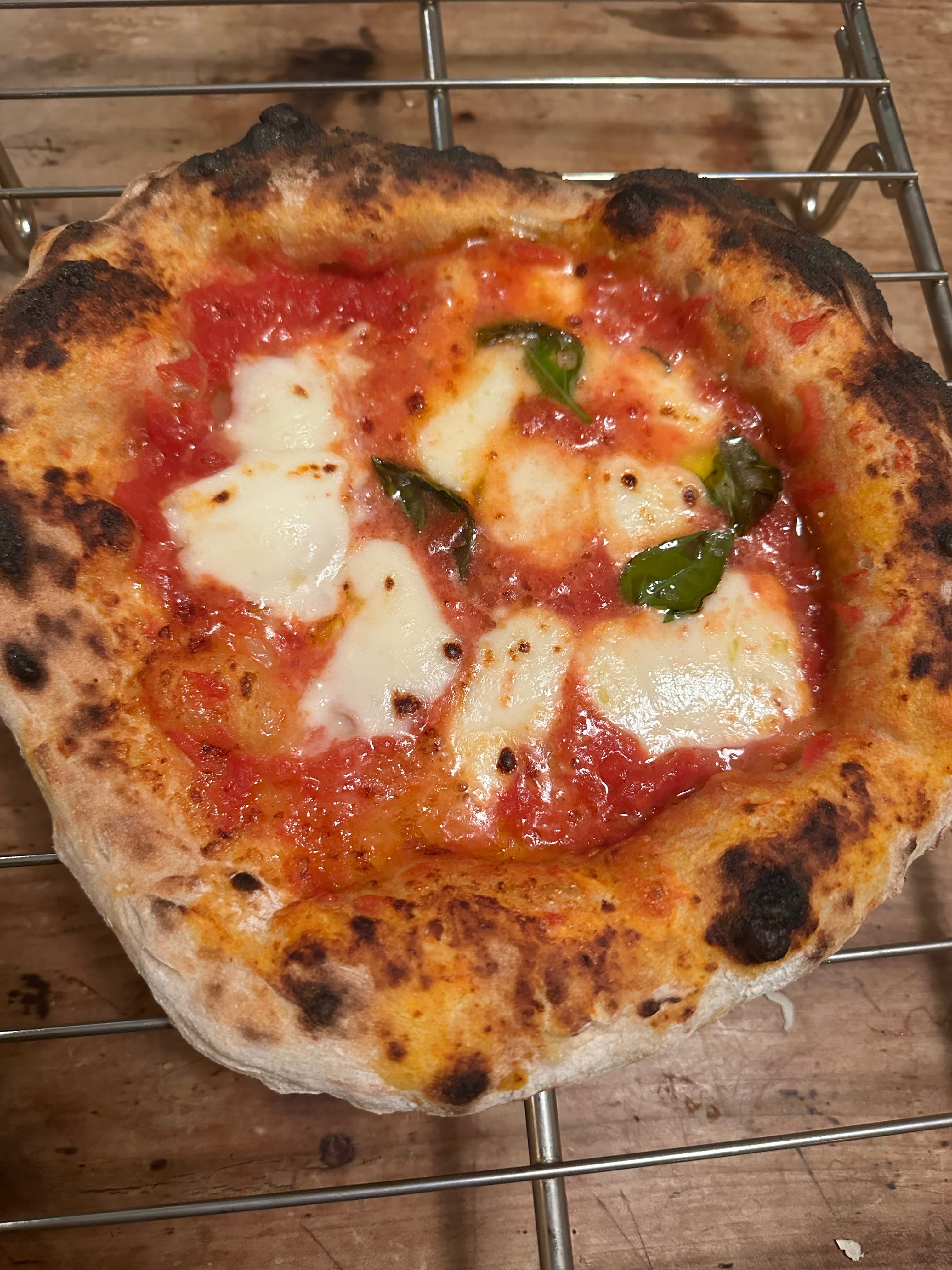 first pie from our new pizza oven, baked at 900f, still dialing in dough workflow for our poorly heated bungalow.