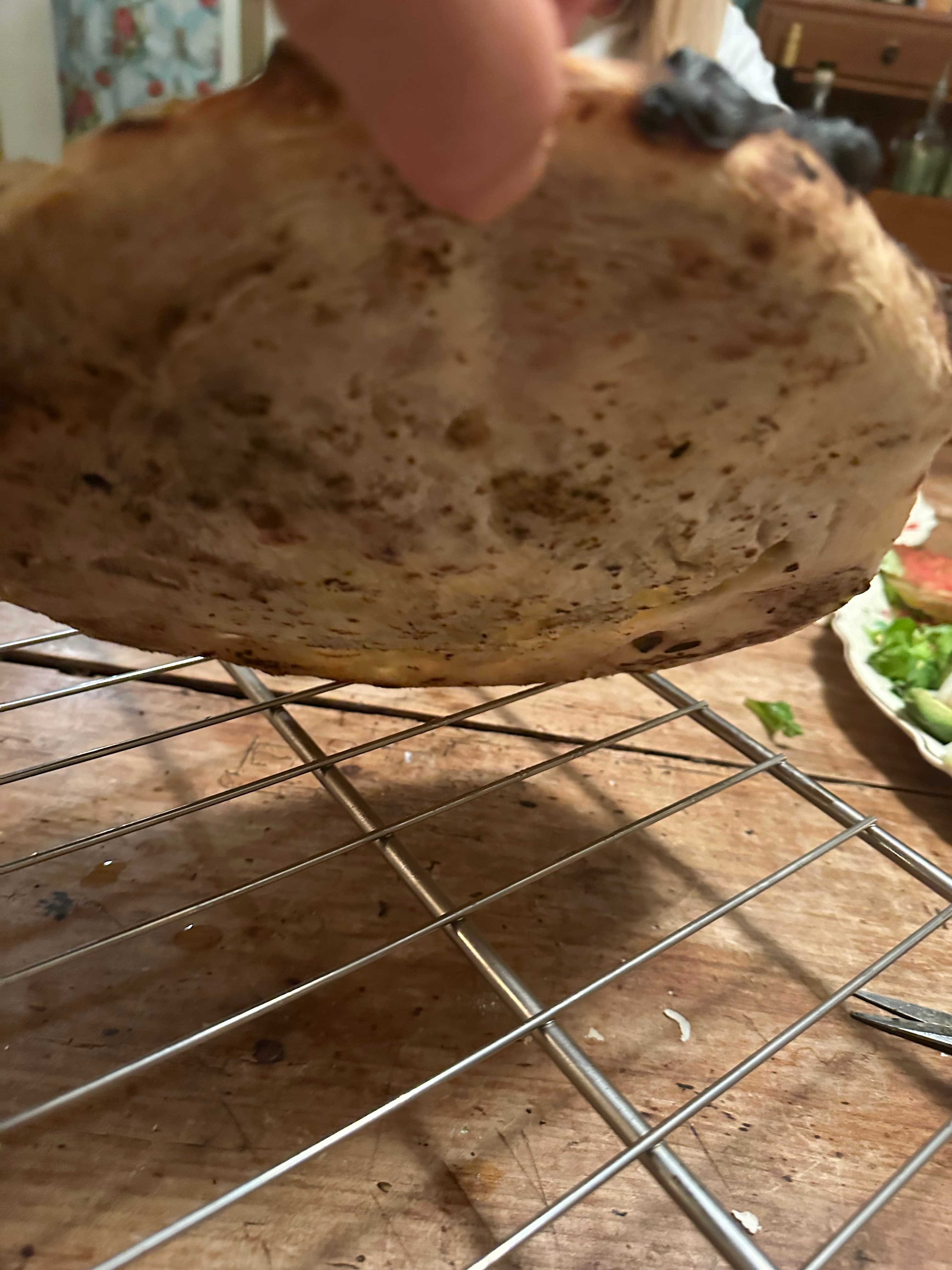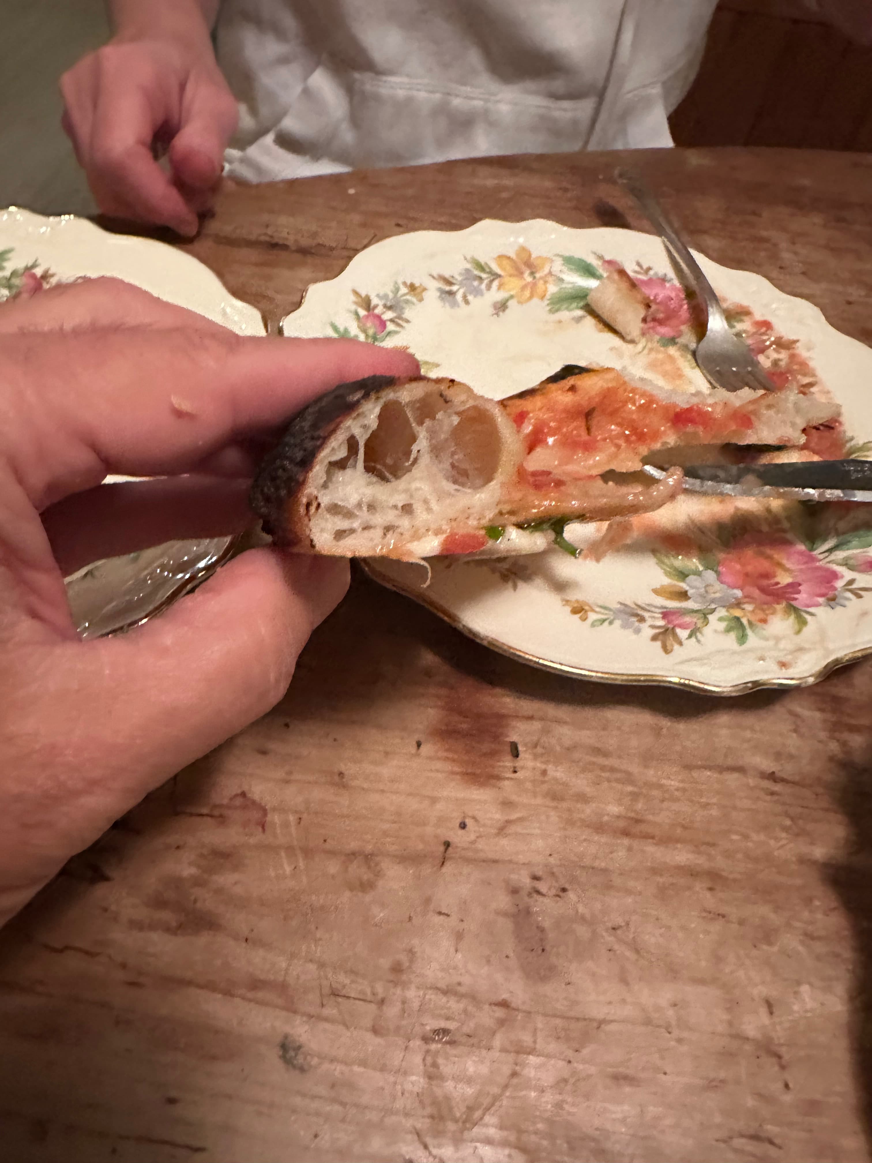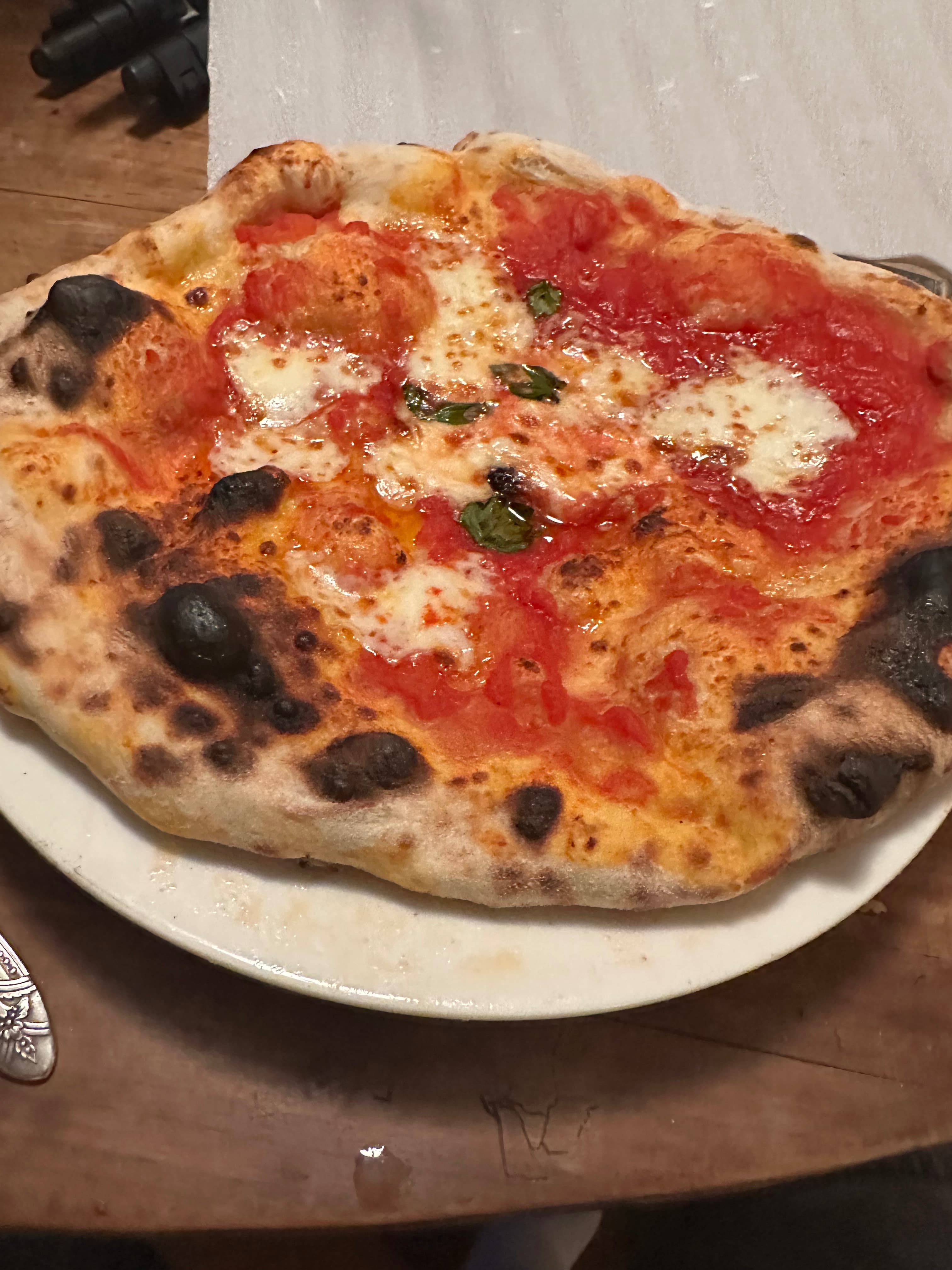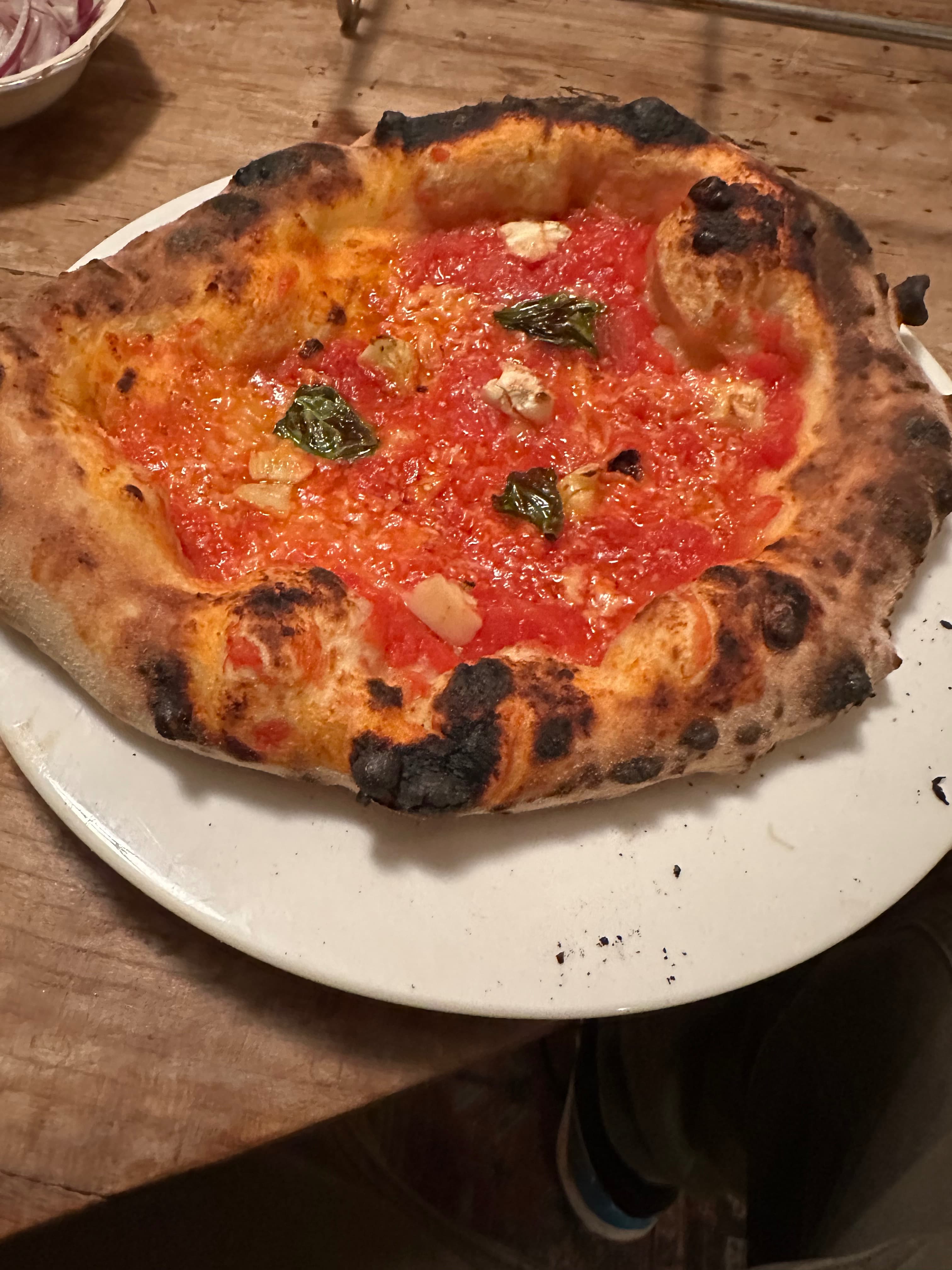 first pie from our new pizza oven, baked at 900f, still dialing in dough workflow for our poorly heated bungalow.