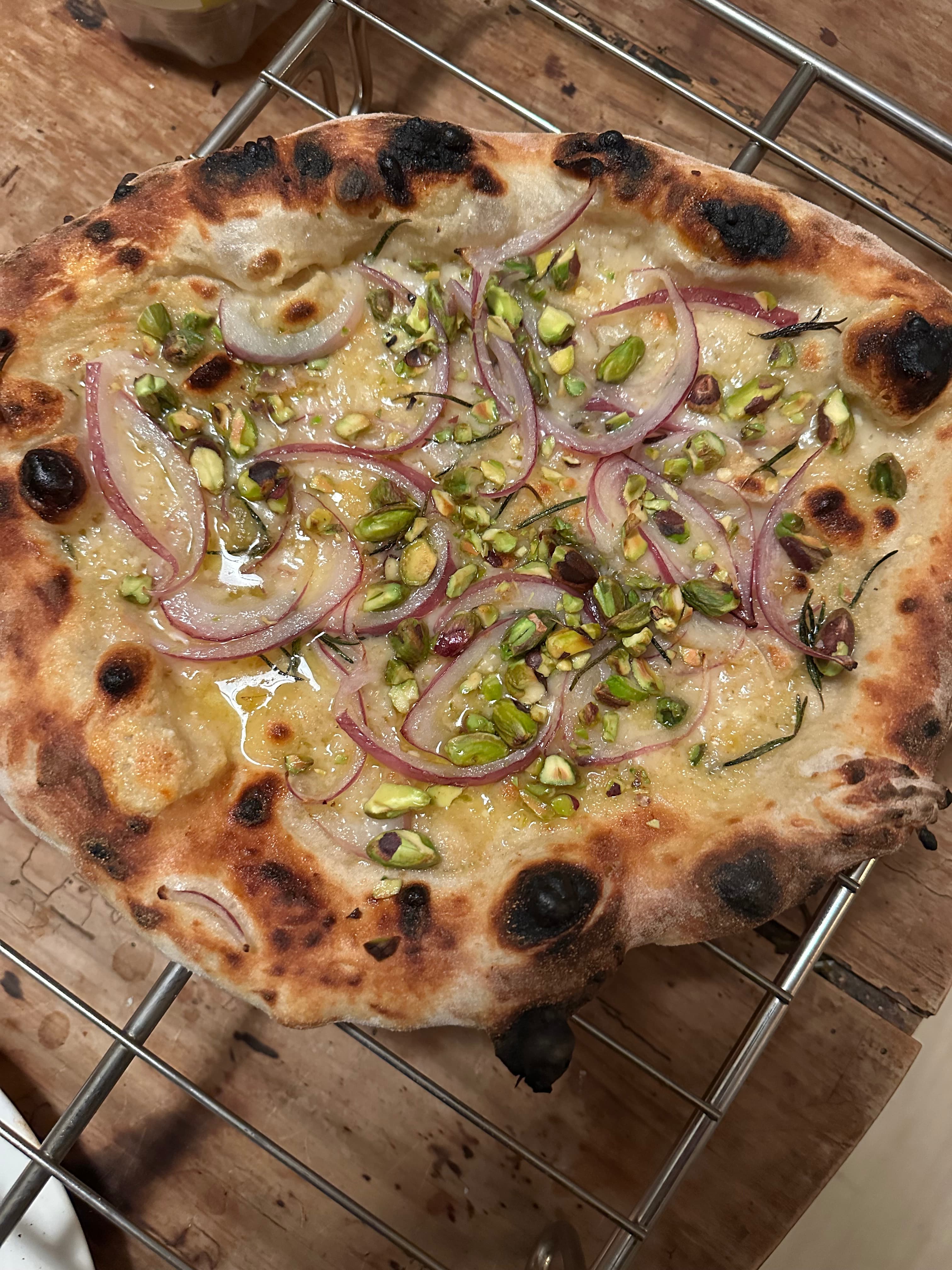 First pie baked at 900f, lowered temp to 800 for this riff on chris bianco’s rosa pizza