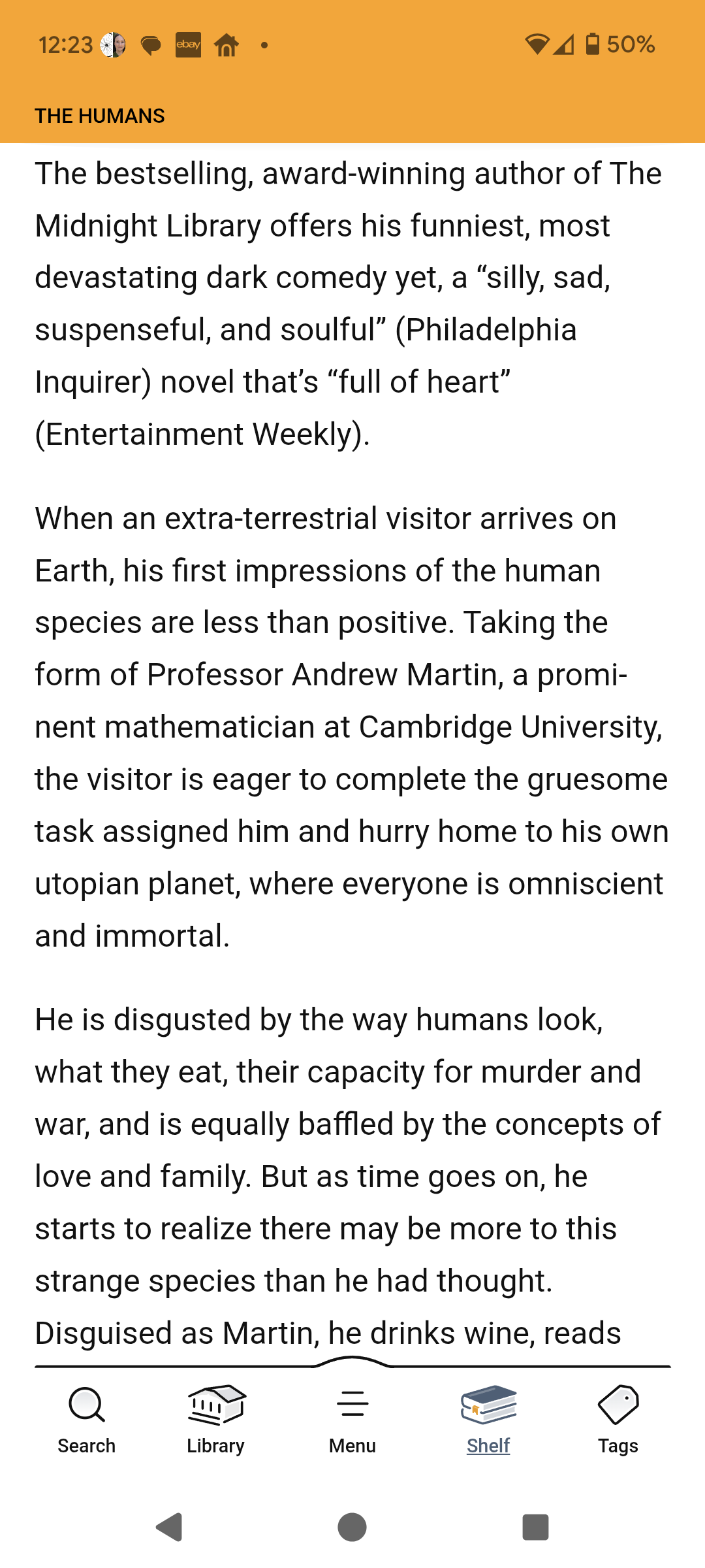I’m reading The Humans by Matt Haig and loving it. It’s funny, thoughtful, poignant, and easy to read.