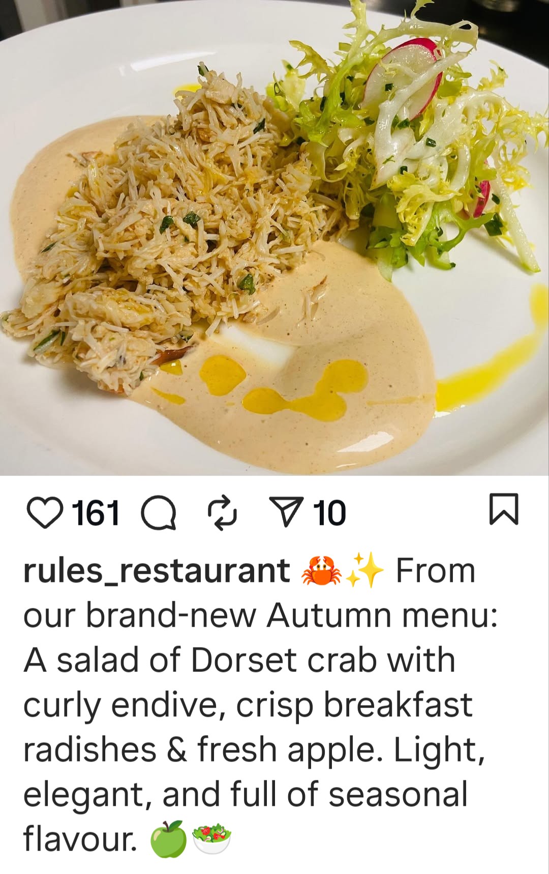 This was the meal my wife and I like to call the “Office Christmas Party”. And, like any office Christmas Party, there’s inordinate thought goes into deciding the venue, the food, etc. So, after the umming and aahhing, I said, “Look, I love Rules and you’ve never been, so let’s go there.” So we did. It’s full-on game season for Rules which, it’s fair to say, suits me much more than it suits Mrs H but she still had plenty of choice.