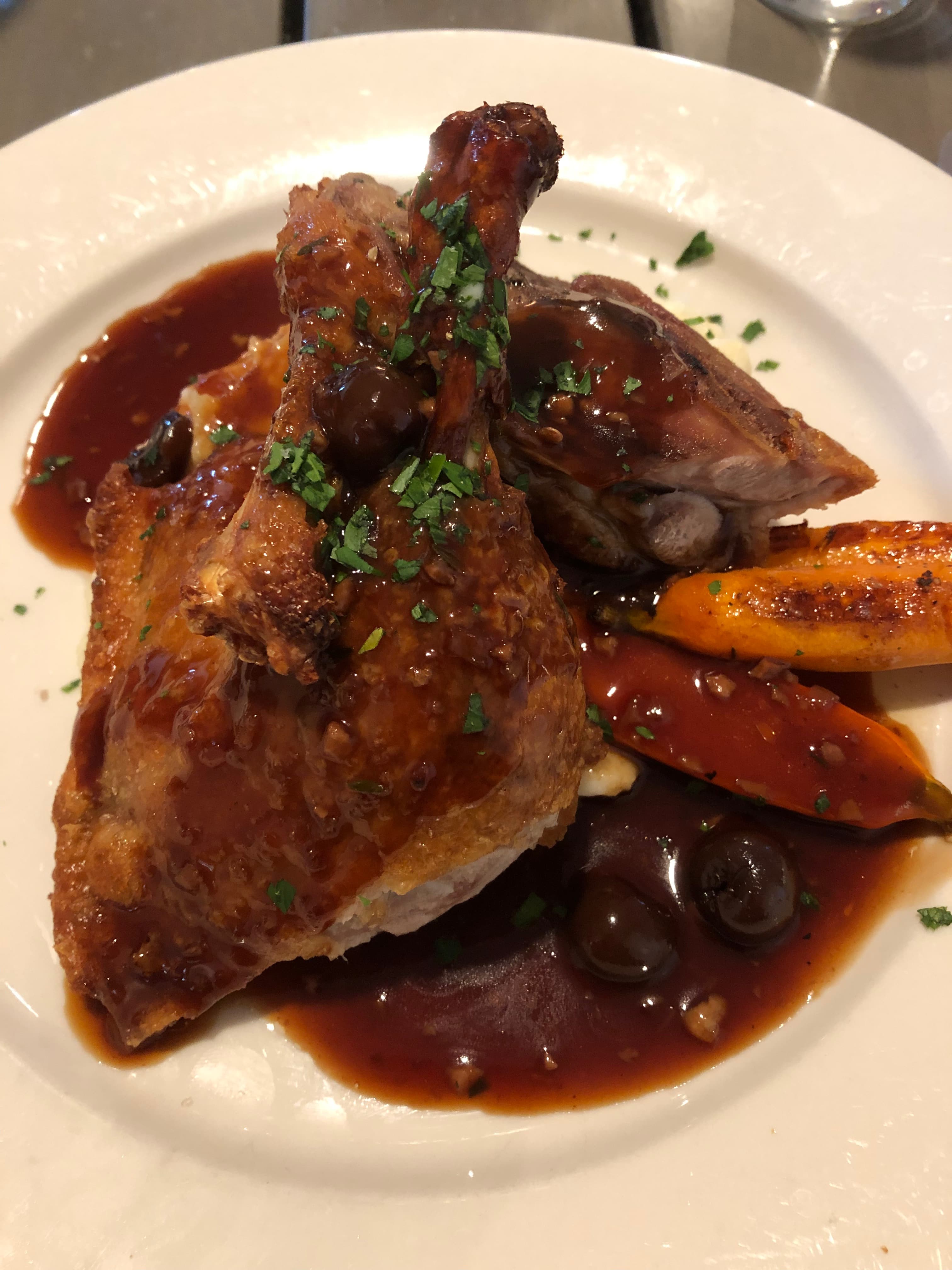 My crispy duck special with cherry jus and roasted carrots was outstanding, sister loved pork chop and broccolini, both with their wonderful cheddar mashed potatoes. Friend had her favorite non-photogenic burger and fries.
