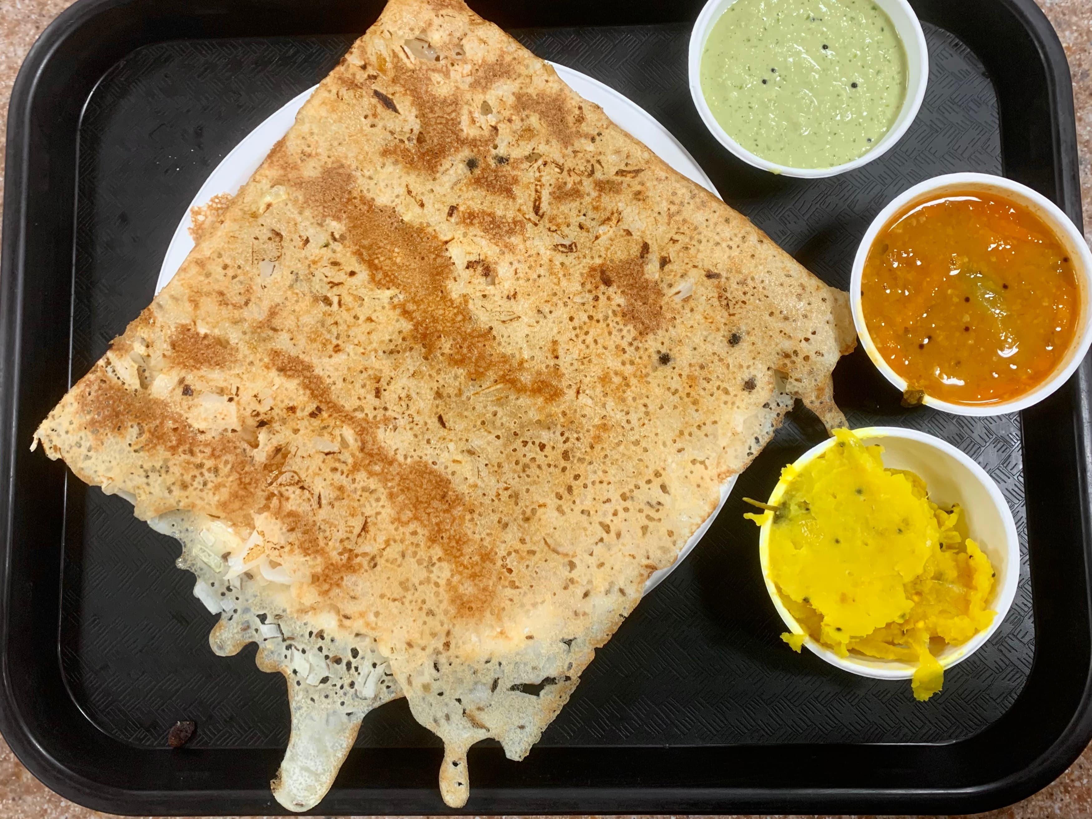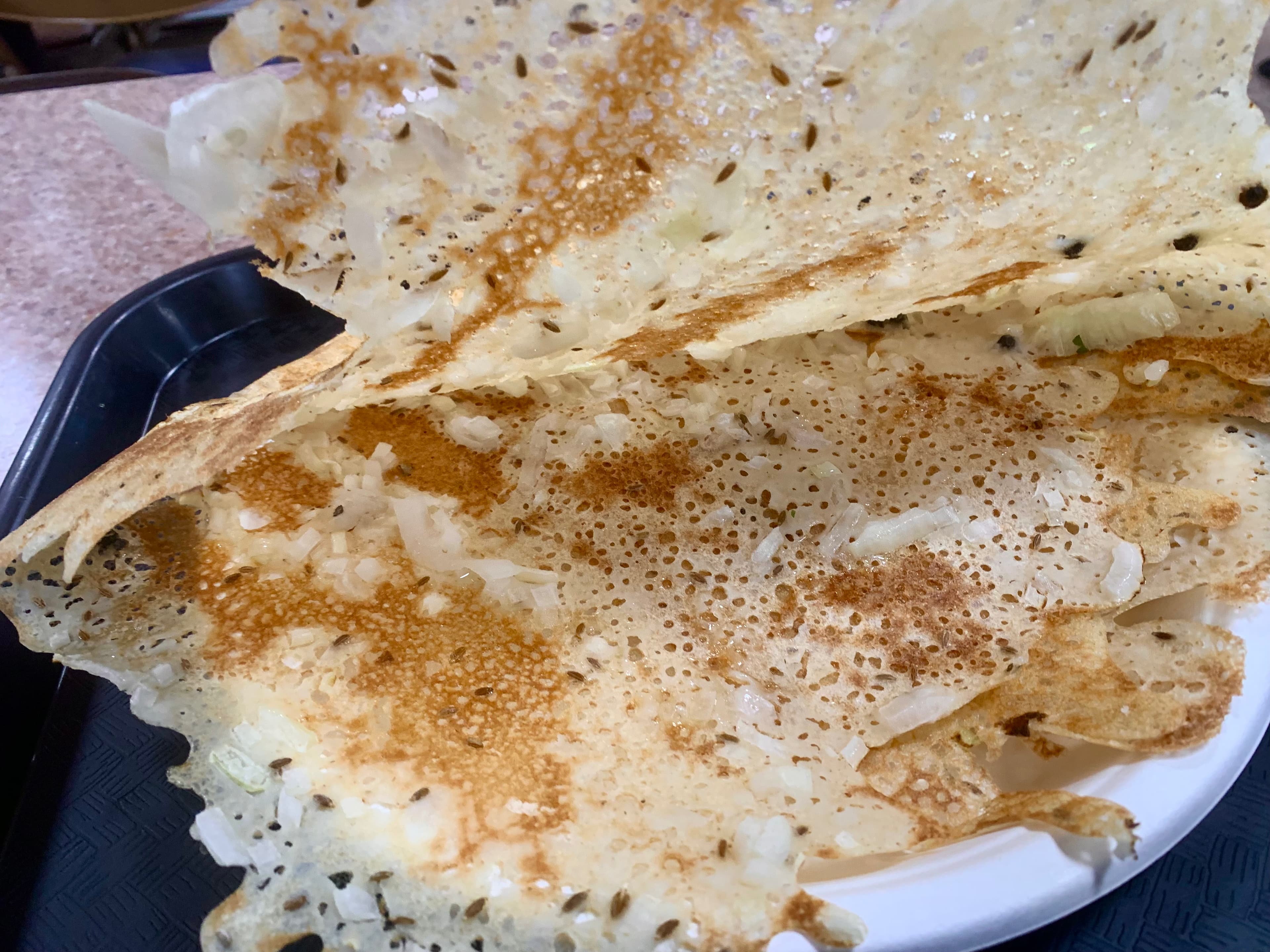 The sambhar was good, the rava dosa freshly made and nicely crisp, though somewhat doughy in parts rather than netted (ie too much wheat flour).