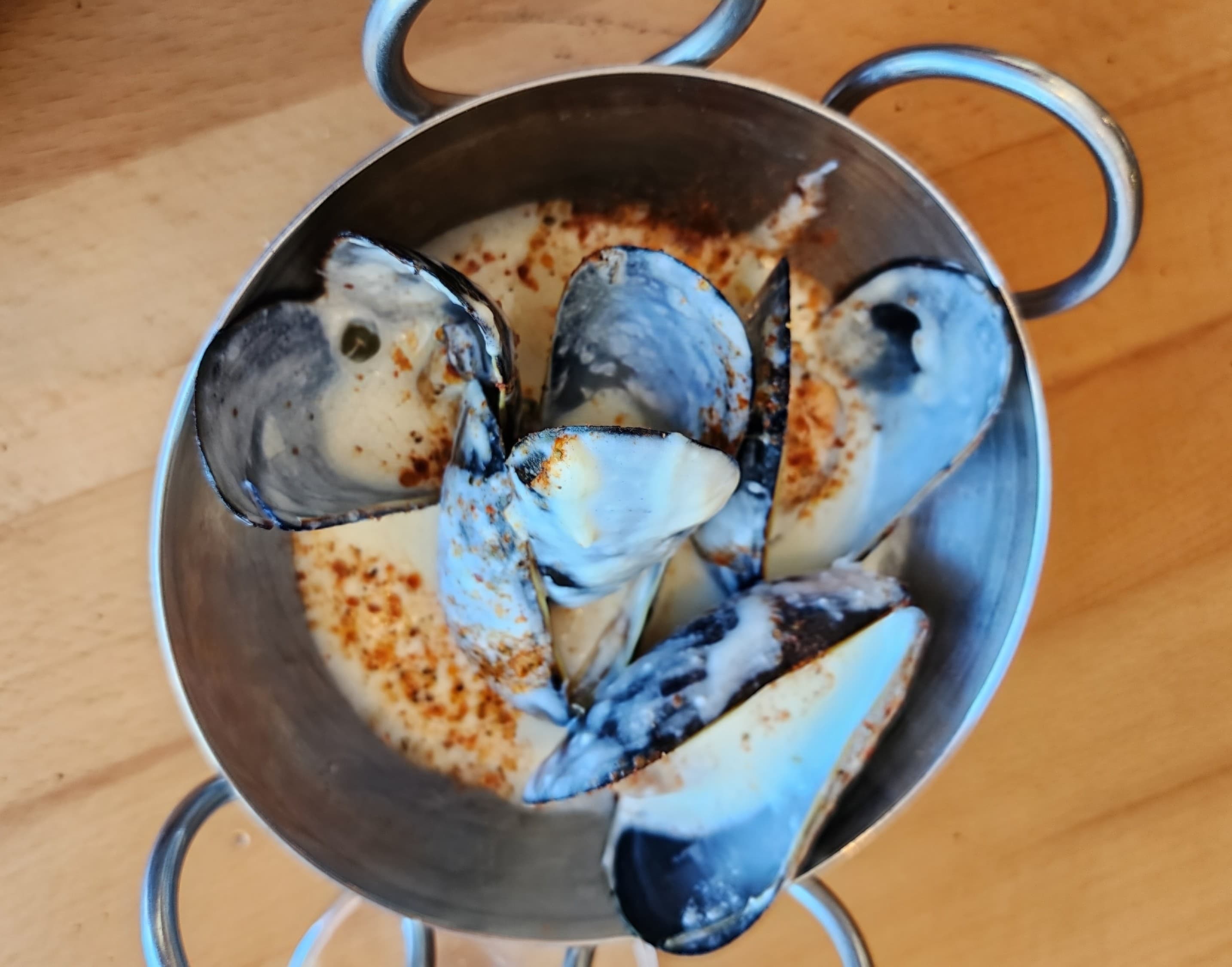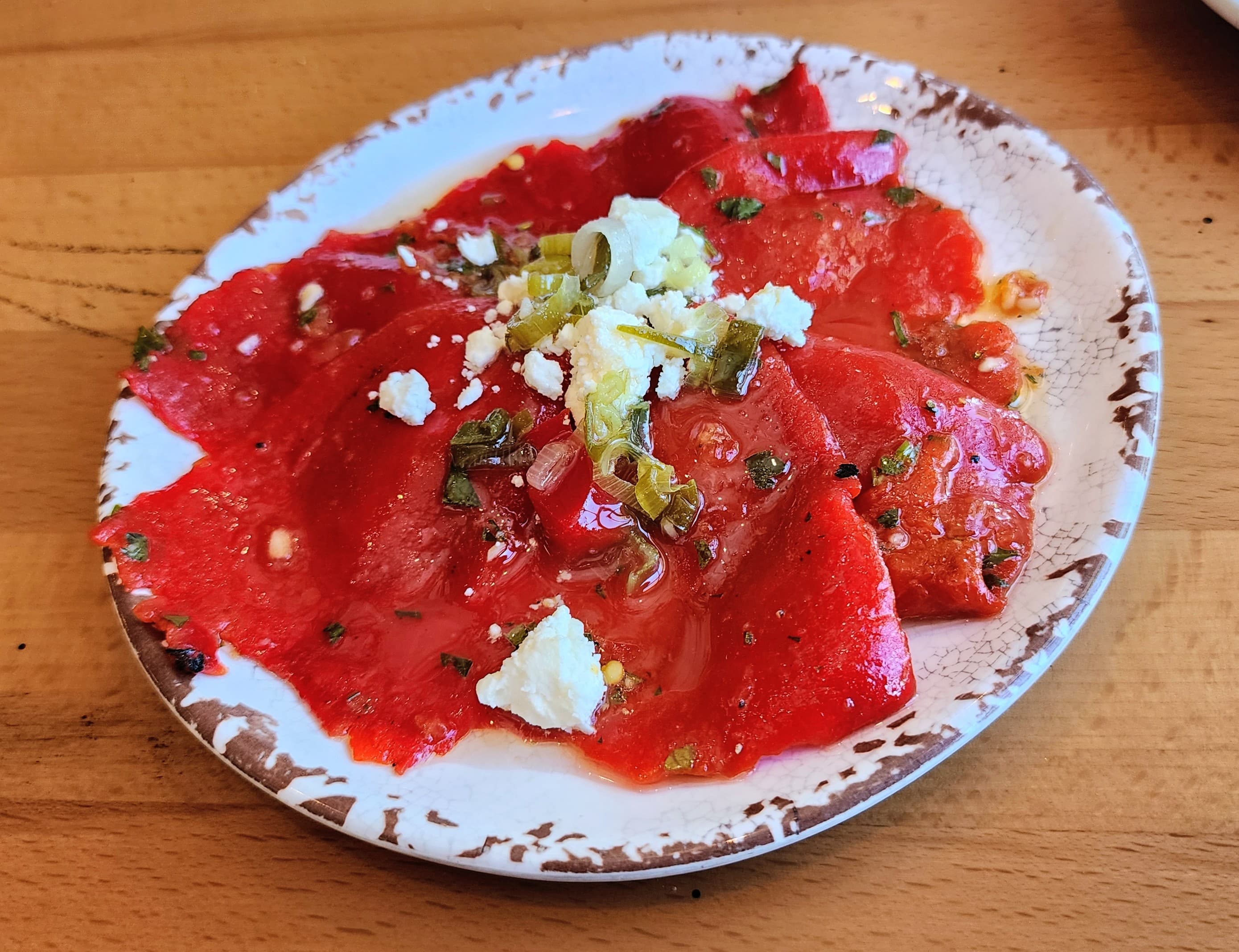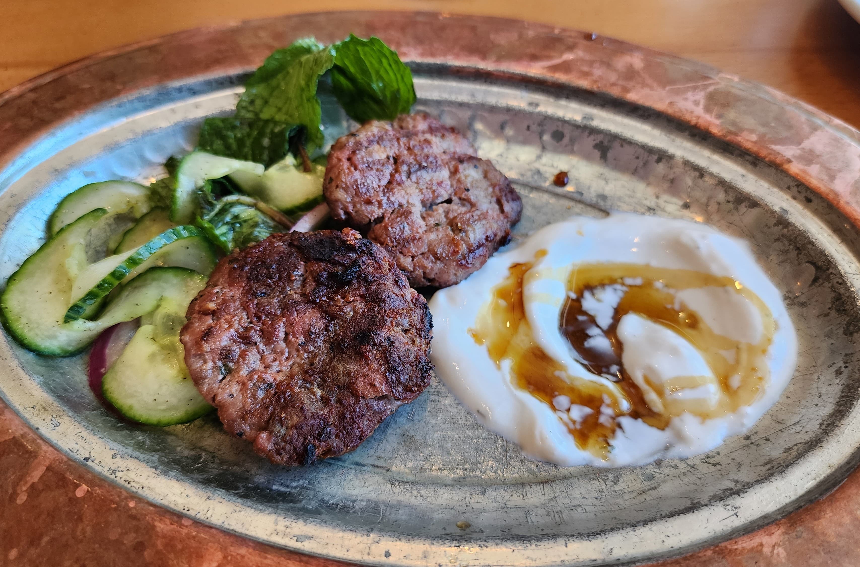 I started out at the East West Cafe in Clarendon, dining outside with a friend and her dog, Harley. We were the most popular people there, or rather, Harley was the most popular one. I ordered Sucuk Yumurta, though I think it had a different name on the menu. Very rich Turkish sausage with lightly fried (poached?) sunny side up eggs. Just delicious! I really liked this dish! As did Harley!
