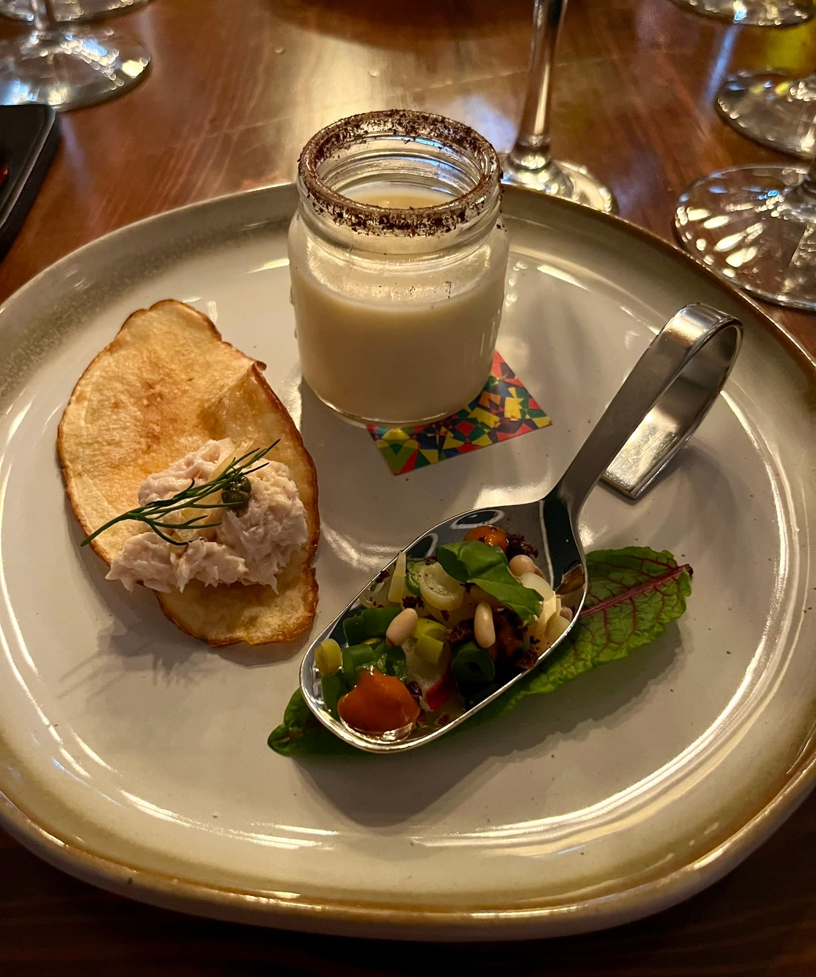 The welcome bites: cantaloupe agua fresca with ginger topped with lime foam & rim of chili lime strawberry seasoning, grilled shiitake mushroom with crispy mushroom salted puffed rice & morel aioli, and carrot juice infused tapioca chip with beet hummus, dukka, and chervil. The perfect introduction of what’s to follow ![]()