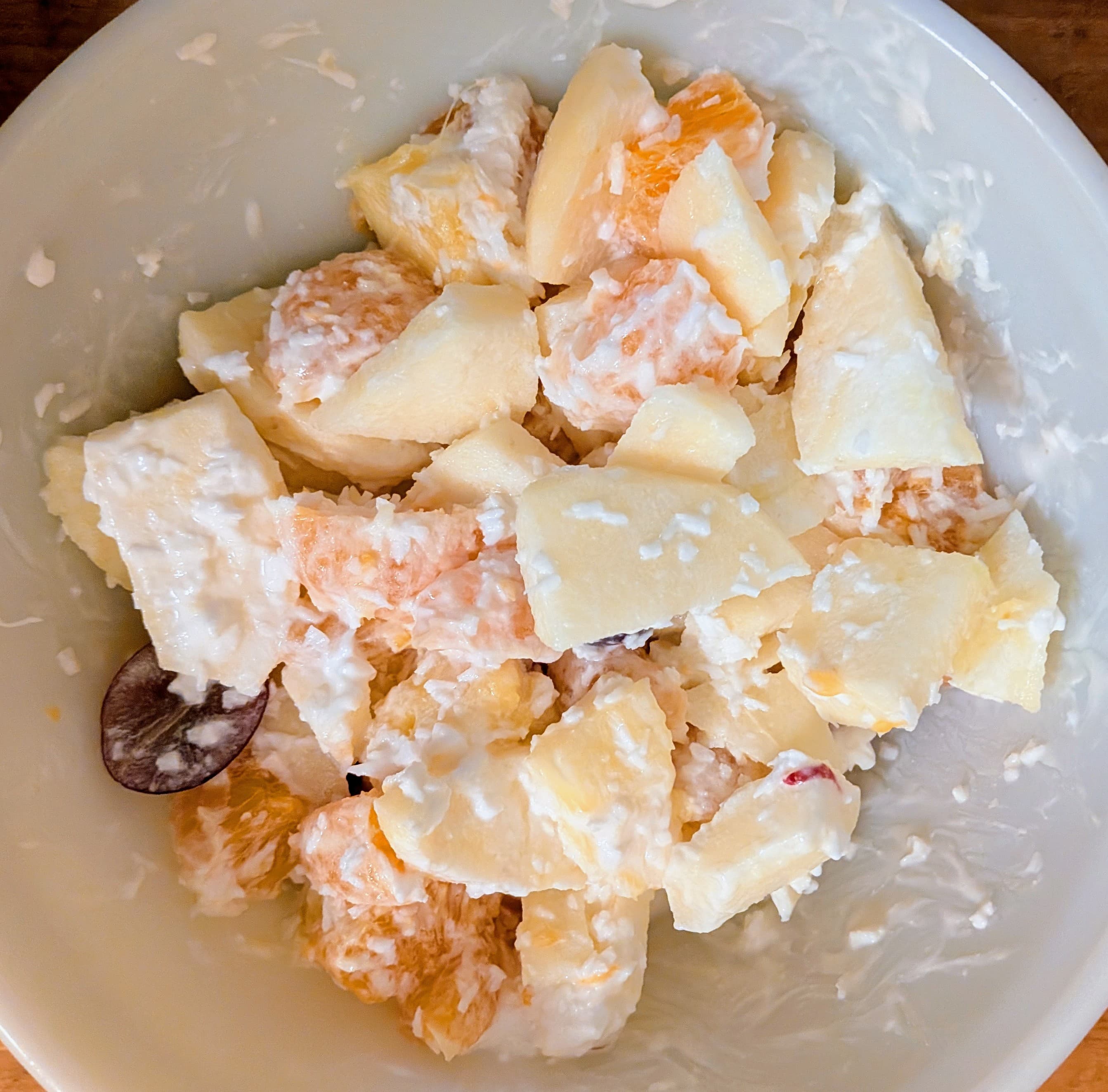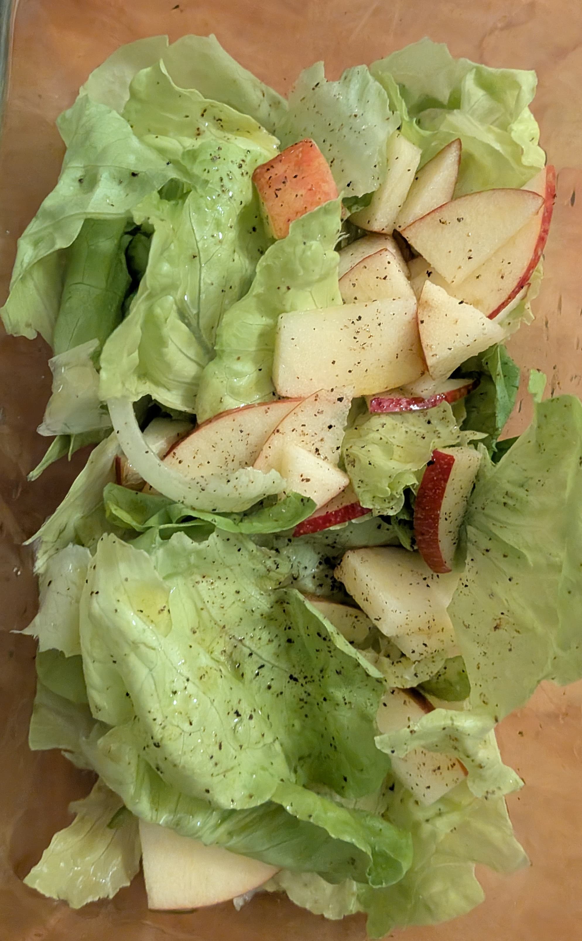 Honeycrisp apple, green onion, celery and lettuce, with olive oil, rosé vinegar, a squeeze of lemon, black pepper, and a pinch of sugar