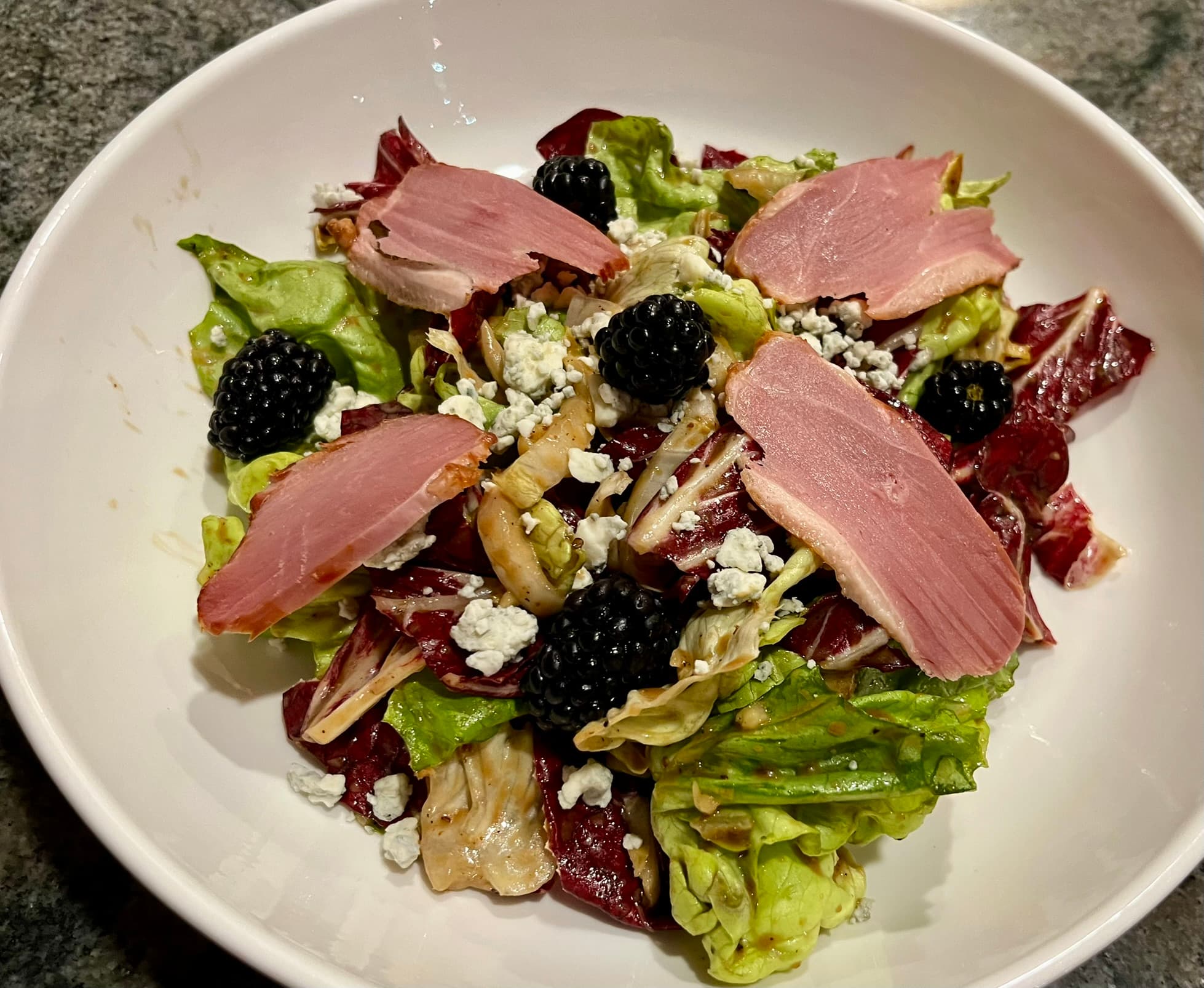 Radicchio, endive, bibb, blackberries, blue cheez, walnuts, smoked duck breast.