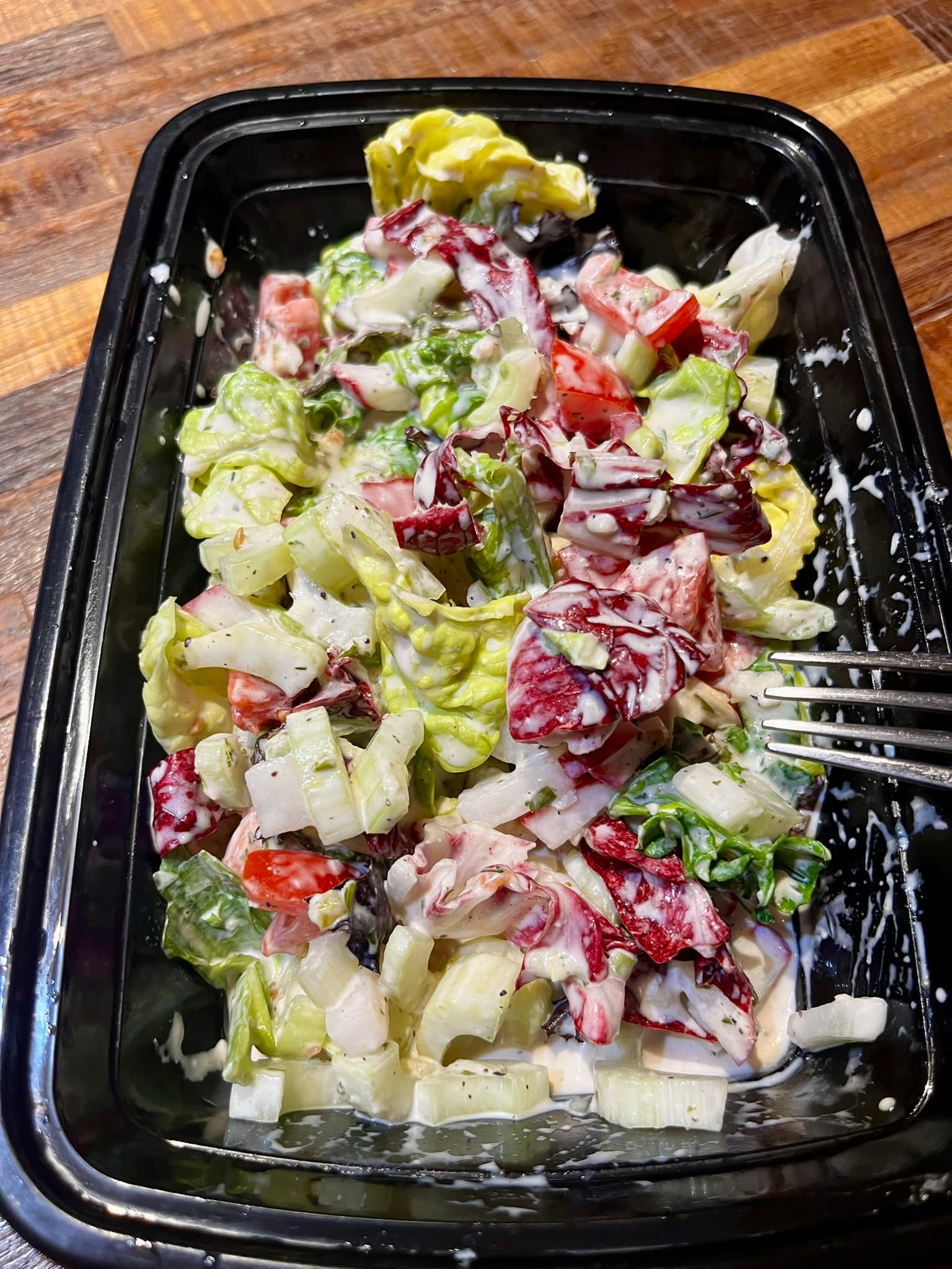 Bibb, radicchio, sunny crisp, radishes, avocado, Campari tomatoes celery with buttermilk ranch. I had to get a few more forks from the leftover container post-dinner.
