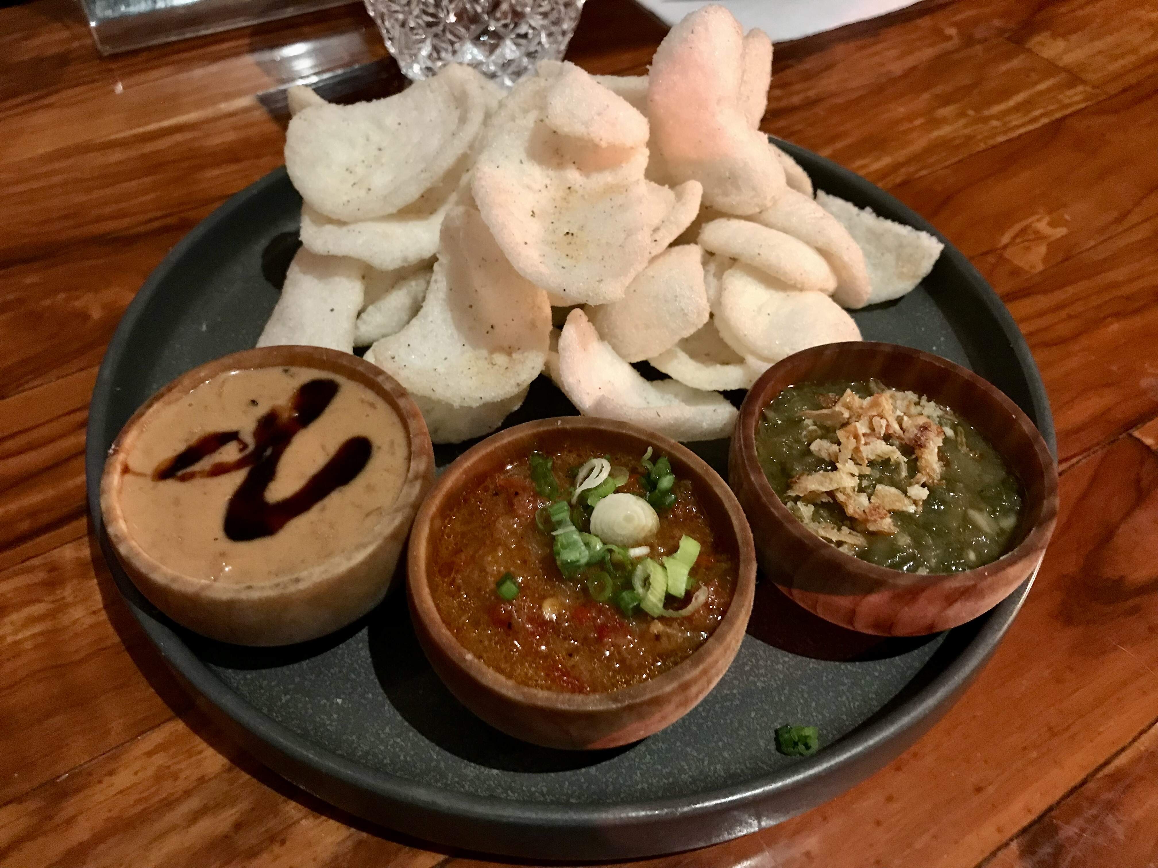 Taking cakumadesu’s advice, we started with the Sambal Flight: sambal terasi (chili and shrimp paste), sambal ijo (green chili and herbs), and sambal kacang (peanut sauce), served with prawn crackers. All were tasty, with the first two having a pleasant amount of heat.