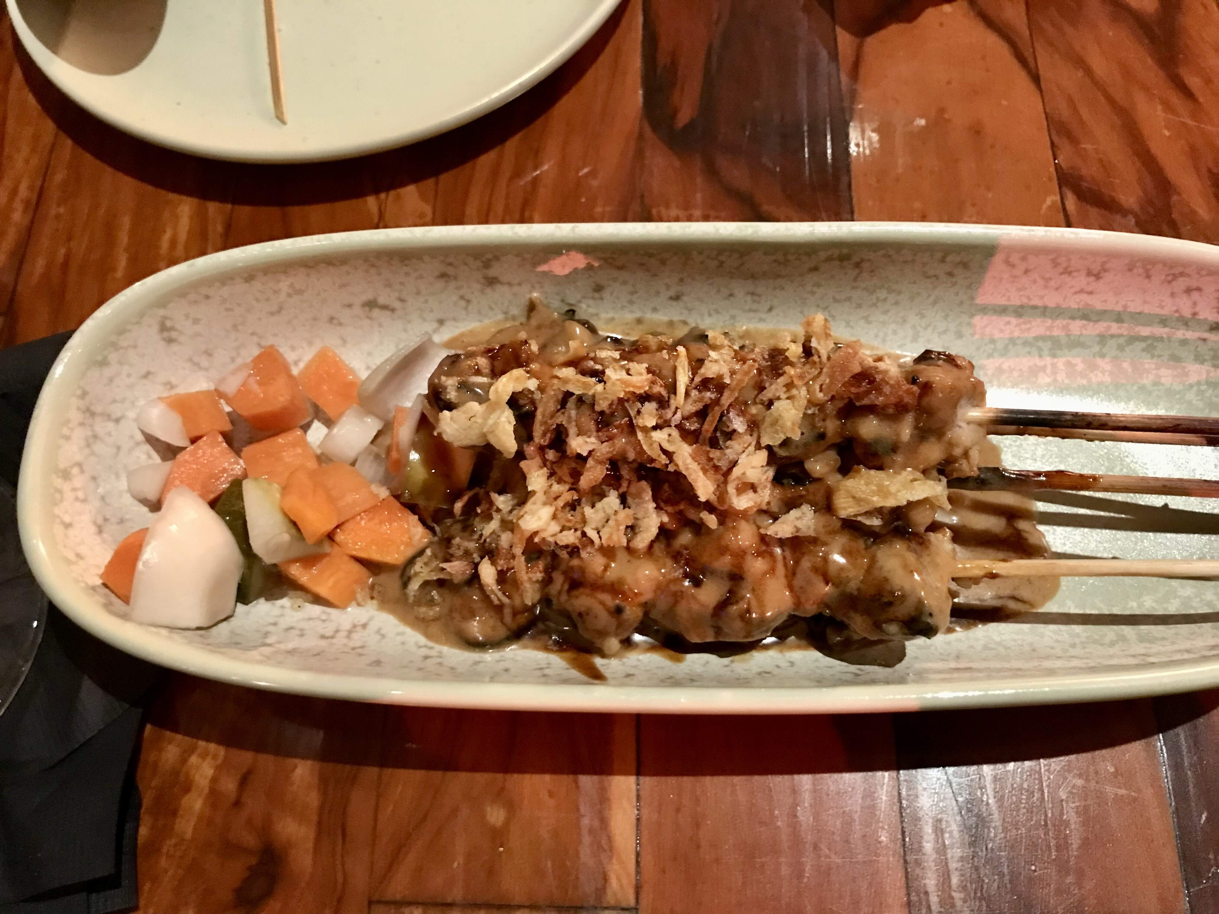 We also had Sate Ayam: grilled moist chicken skewers, covered in fried garlic chips,