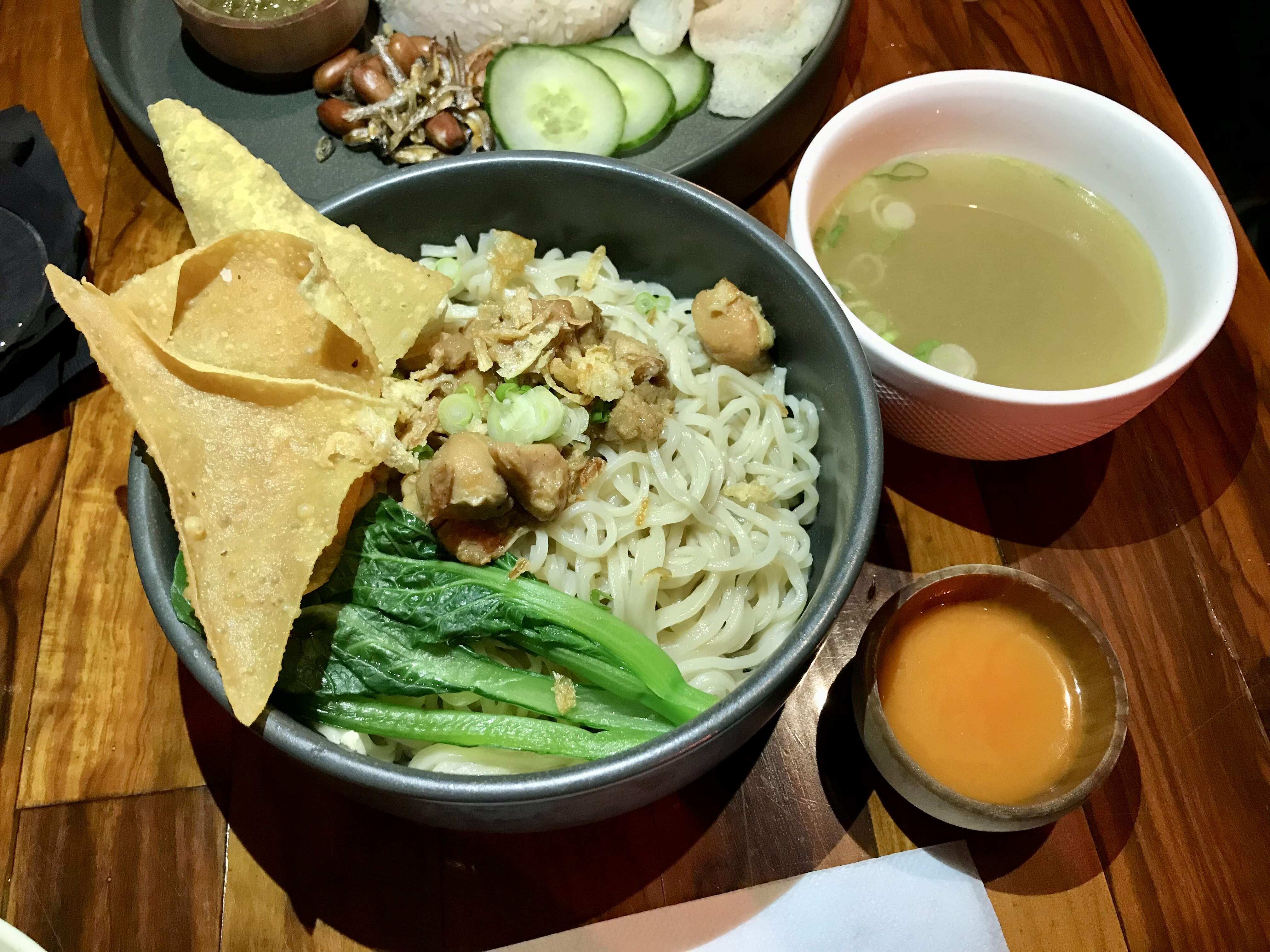 Our first main was Bakmi Ayam: hand-pulled noodles with braised chicken and yu choy, topped with pangsit goreng (fried wonton wrappers), and served with a bowl of broth and some not-so-fiery sambal. The chewy texture of of the noodles was especially great.