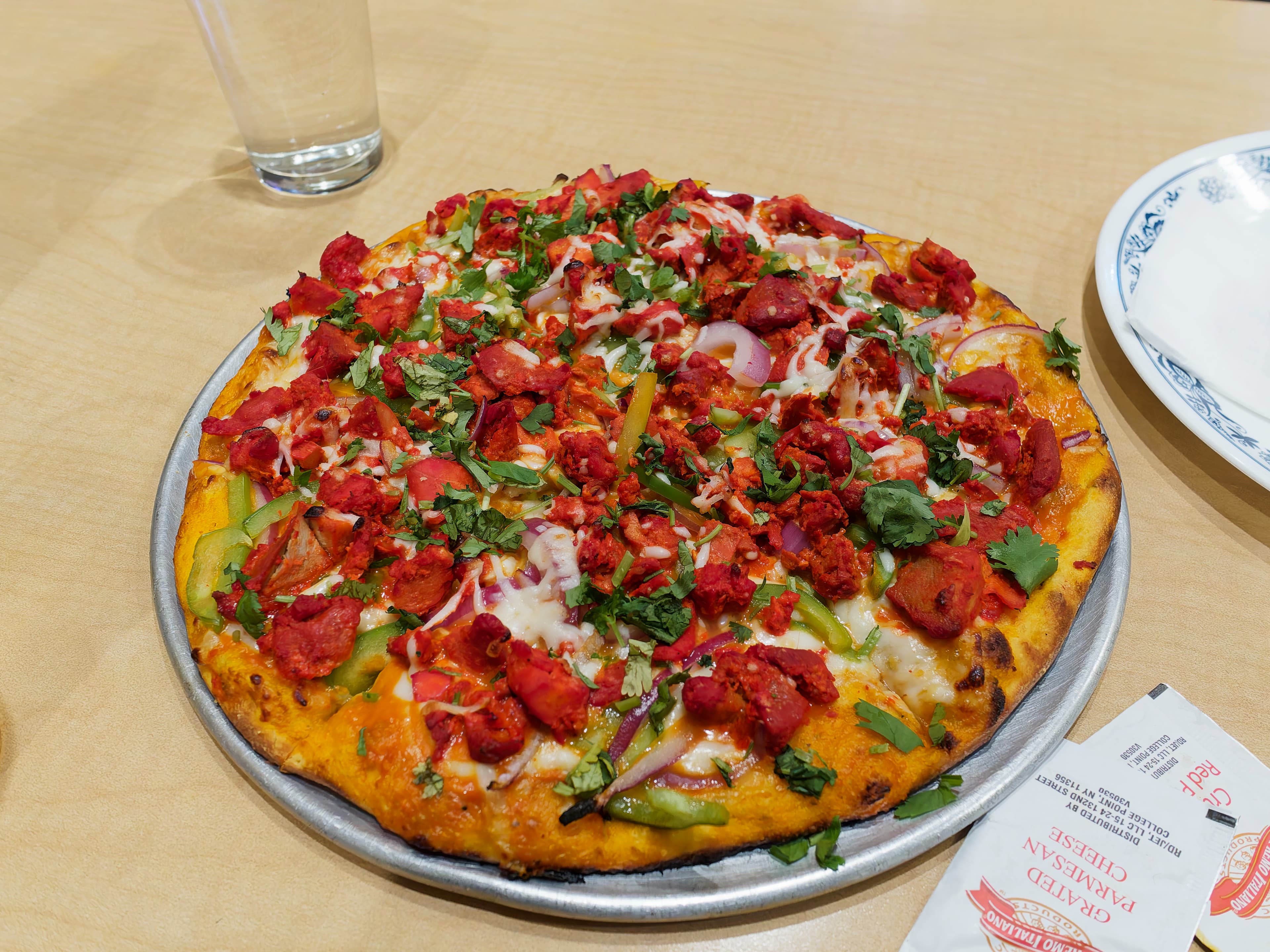 Yesterday I had a chicken tikka pizza from Tadka in the Mission, which is open until 2am. It was not bad, topped with lots of neon red chicken. It was a little on the wet side, possibly due to the plethora of toppings. There was tamarind sauce and packets of parm and red pepper as condiments.