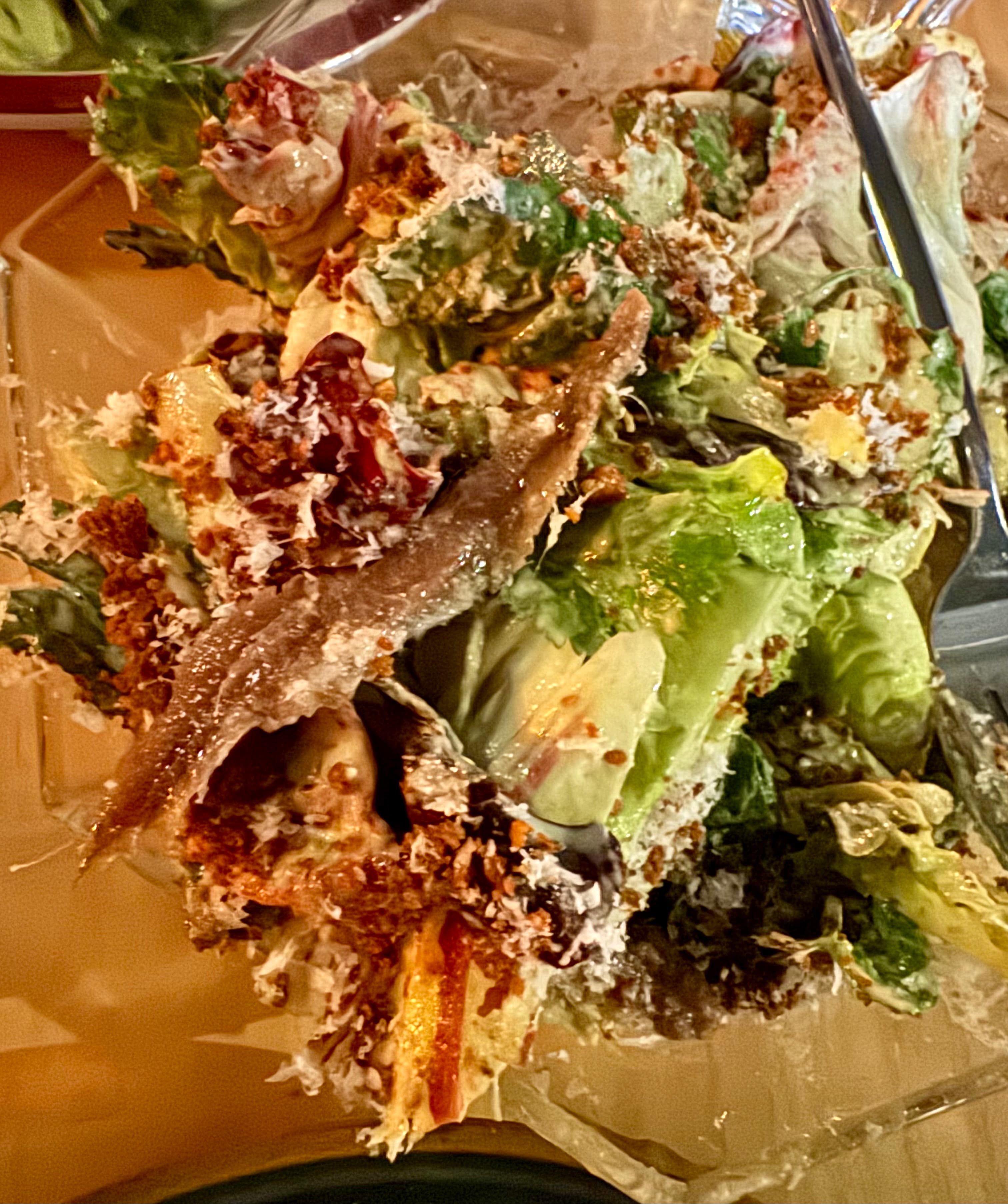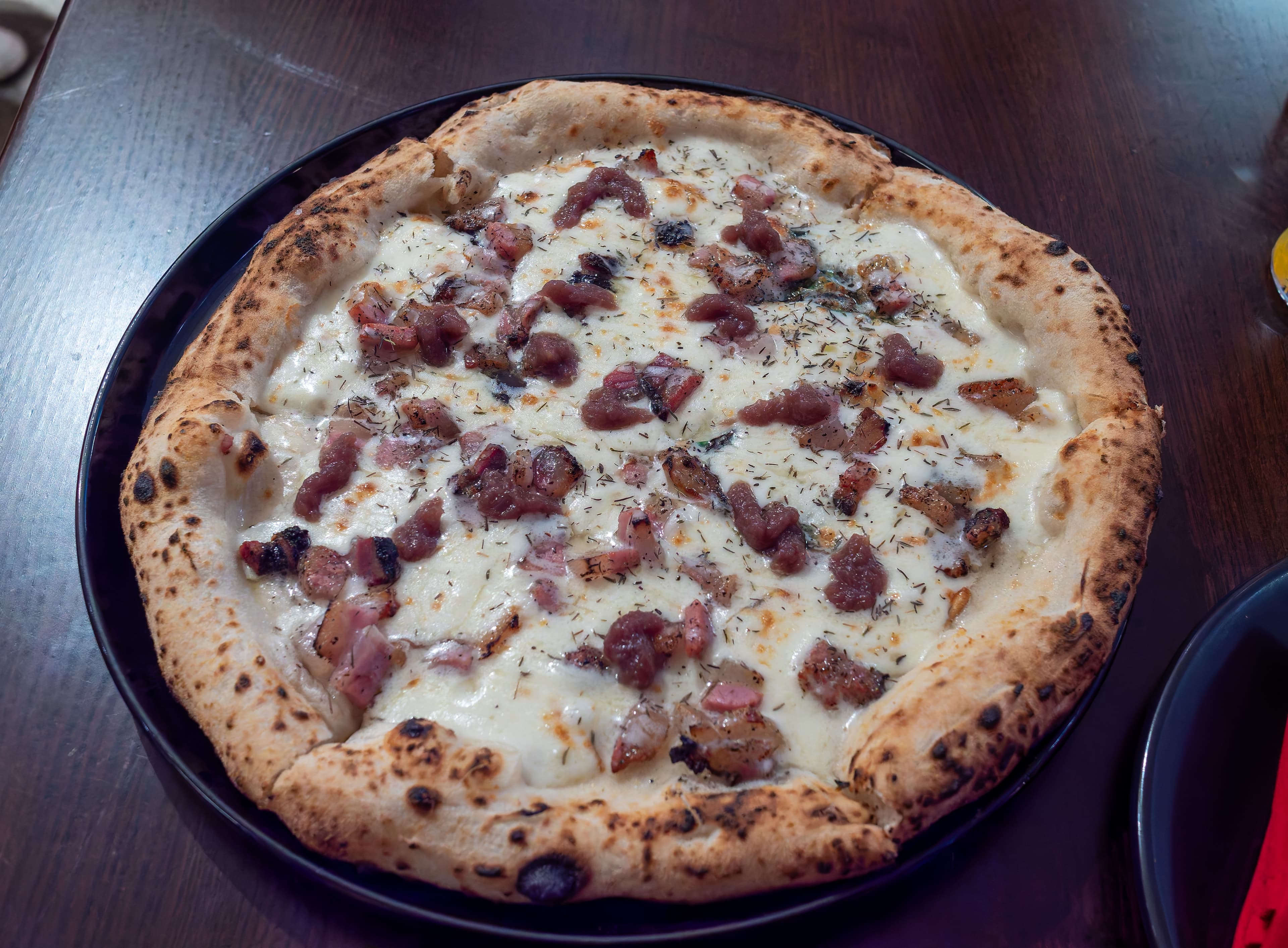Last weekend I had a pizza from Steps of Rome Trattoria in North Beach, which reopened this year in the former Cassava space. I had the eponymous Steps of Rome pizza ($25), which has mozzarella, guanciale, pecorino romano, thyme, caramelized onion, and EVOO. It’s a white pie without any tomato. It was a very good pizza. The crust was more Neapolitan style than Roman tonda style I think, it was tender with a puffy cornicione. There was a lot of cheese on it, with some sweet caramelized onions and sweet fatty chunks of guanciale. There was also some thyme which gave it a nice earthy herbal flavor.