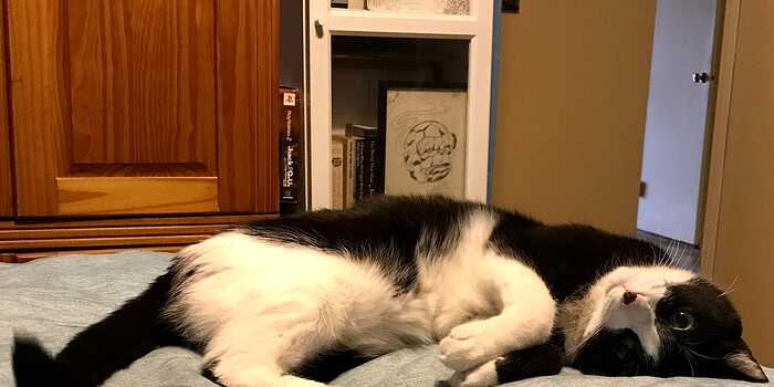 One of my sister’s cats, Eddie Spaghetti (With the Meatball Eyes), is chillaxing in Maine. Lena (a three-legged kitty I named) decided she wanted nothing to do with me.