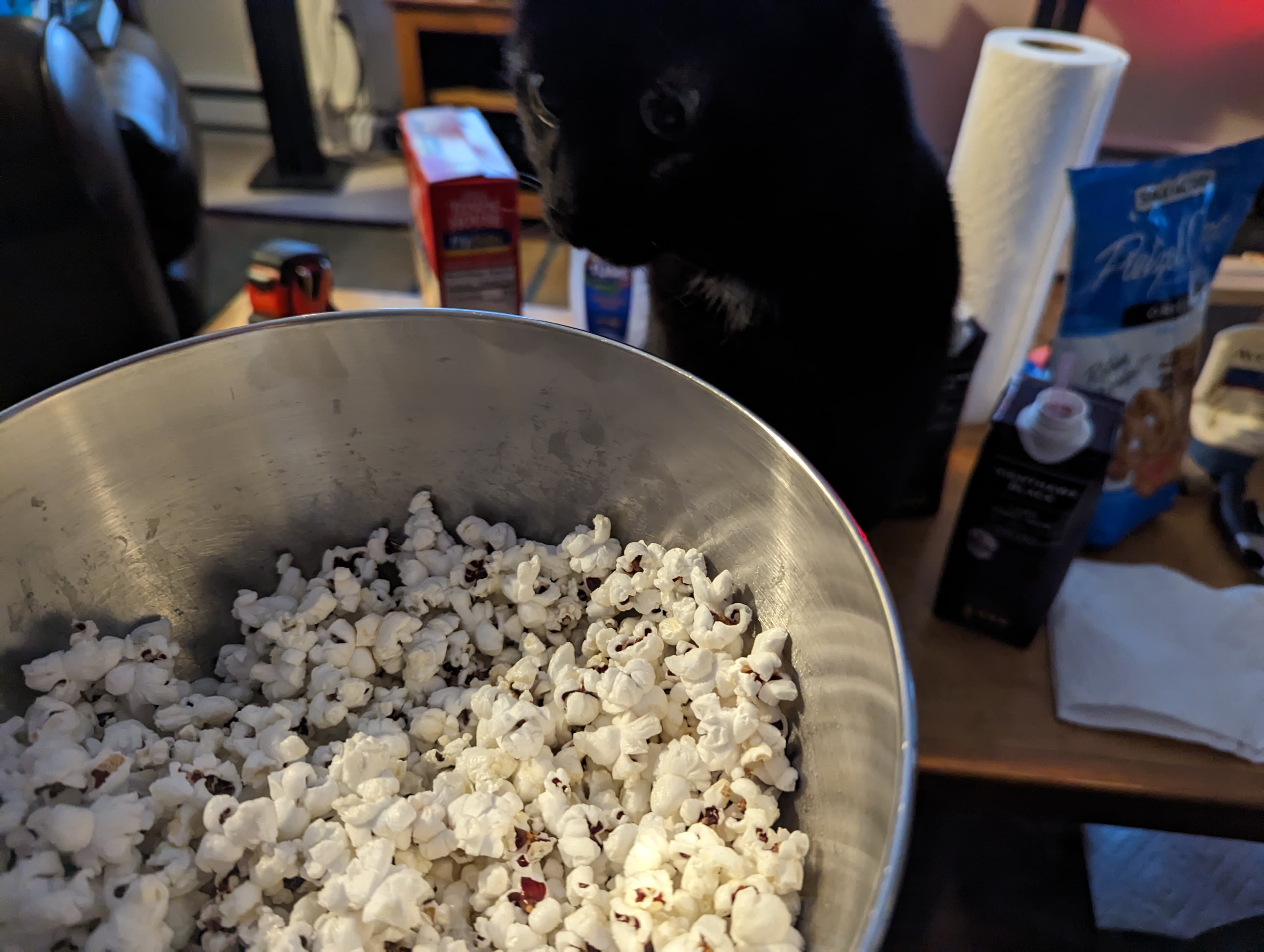Since our boys were found dumped in the middle of BF nowhere, we’ve no way of knowing their prior living situation. What we do know is that they must’ve been introduced to human food, bc they love it. All of it. Any of it. We were beleaguered by both of them when I made popcorn for us last night (maybe the lamb fat & ghee mix I used to pop it was the reason).