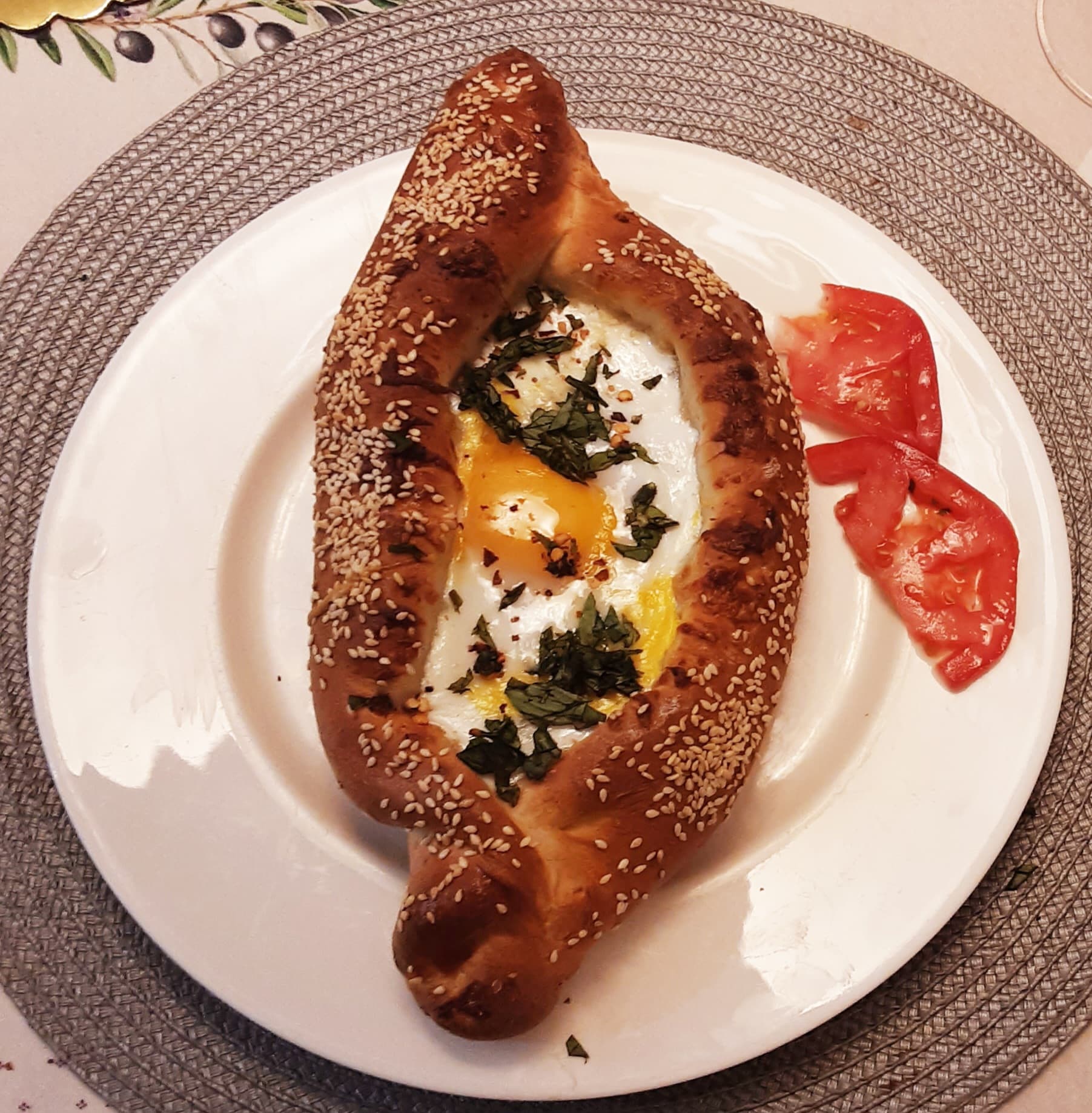 I made Khachapuri, which is a Georgian dish. Popular in Georgia and surrounding countries. A bread like dough is made. Rolled into an 8"×10"oval and filled with mozzarella, feta,blue cheese, and parmesan. Sides are brushed with eggwash and sides and sprinkled with seasame seeds. After baking, an egg is cracked on top and baked for about 3 minutes. It is delicious but the serving was huge. I only managed a third and DH half. Luckily my son was here and showed us how it’s eaten. It’s from a book Turkuaz Kitchen.
