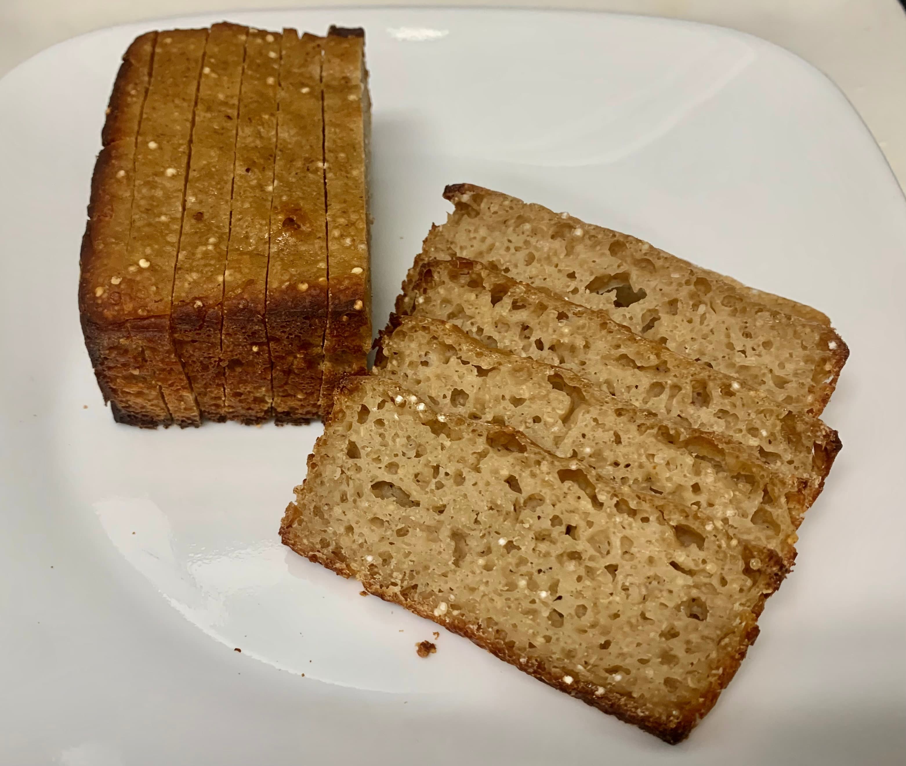 ETA: Now that I had some toasted, I should be less critical – it’s very flavorful, and firm like the flax quinoa bread from Whole Foods that was the inspiration, but not heavy / dense the way last week’s was (should have been obvious to me given the holes).