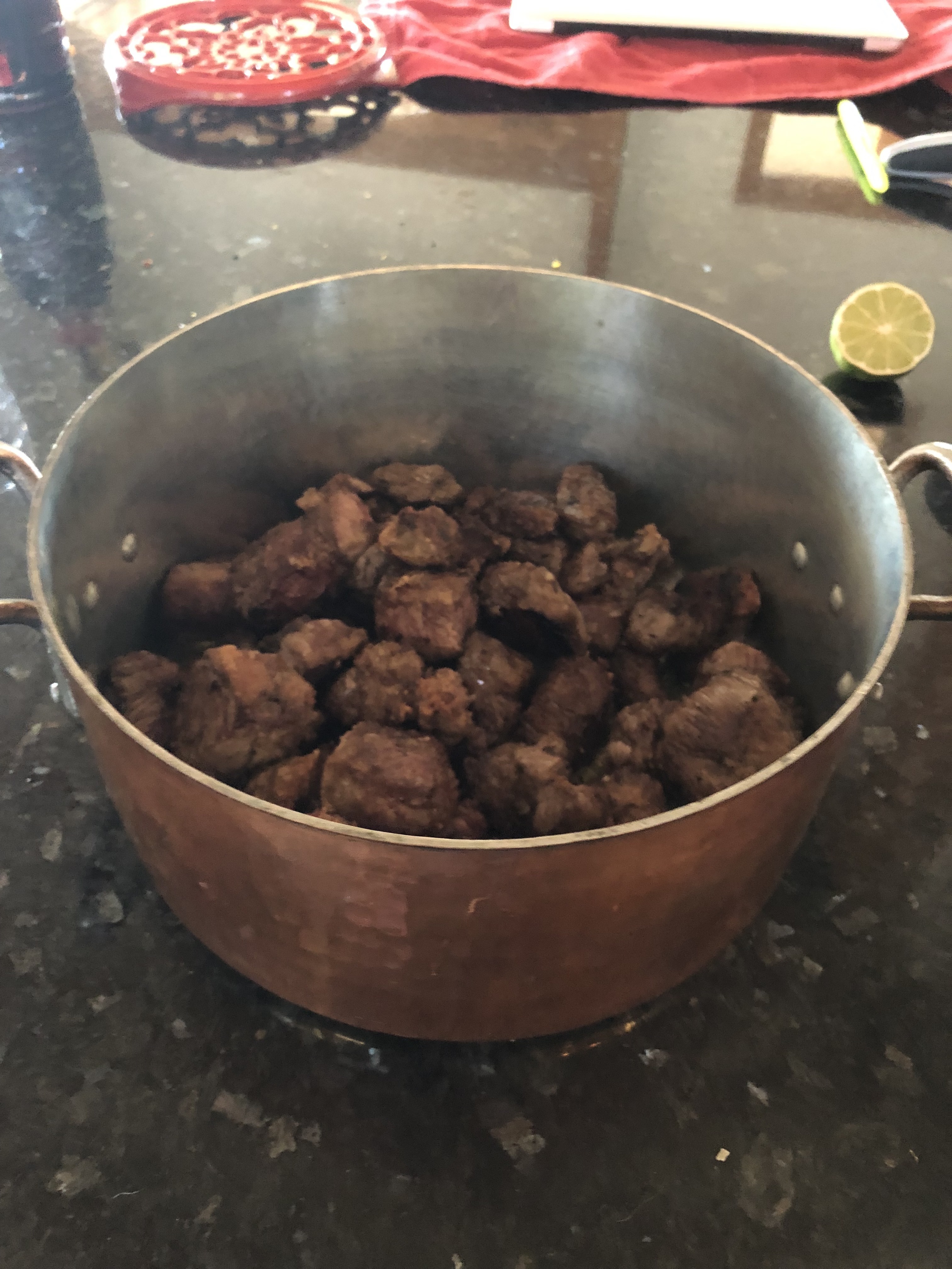 So, am cooking some beef that he purchased these from the DC farmer’s market which I believe are short ribs . I browned them on high heat in my cast iron skillet after dusting them with sweet potato starch, added caramelized onions, garlic, bay leaf, freshly ground pepper, thyme, oregano, bay leaf , carrots, celery , beef broth, couple tablespoon of tomato paste and braised it on top of the stove in my 1940’s copper havard pot . ( I will not allow him to use my havard C splendid***copper pot as it is 4-5 mm tapering to 2.5 mm on top weighing 8 lbs. So, nobody use it except me and only when I am not in a hurry as it is really heavy. It is very old but looks like red gold ) I then added some pinot noir to it, then baby potatoes at the last hour. . Cooked in lowest heat for hours, then added a bit of potato starch to thicken it. He scooped some out into my onion soup bowl, after lining it with puff pastry sheets above and below, added some Kerigold Dubliner cheese, cooked it in the countertop oven til the pastry puffed. He says it tasted good. ( I am not allowed to taste beef)