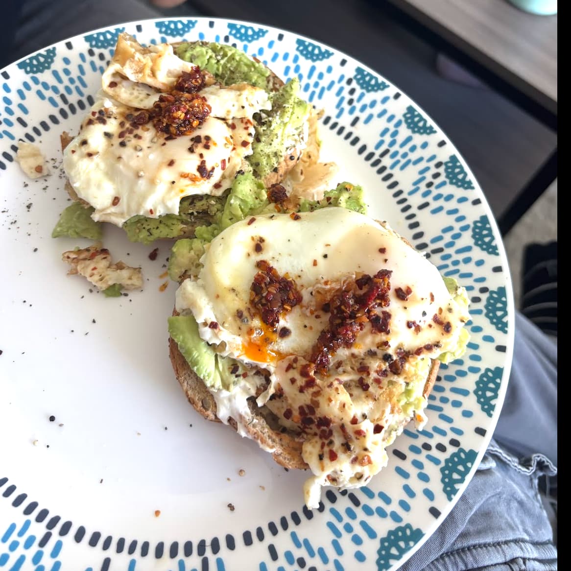Been loving my morning bagel; toasted, with some whipped cream cheese, smashed avocado, and a poached egg with lots of chili oil ![]()