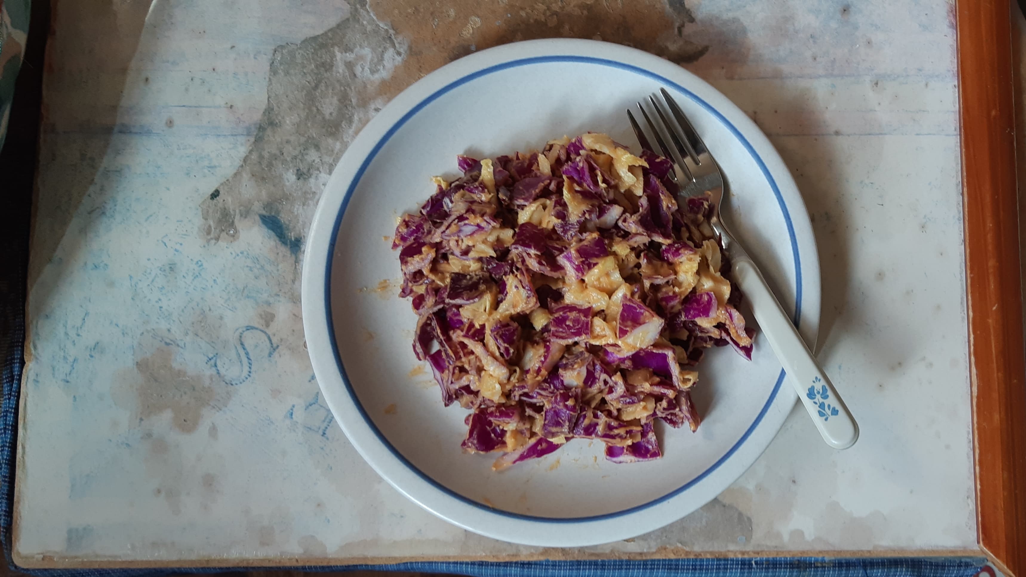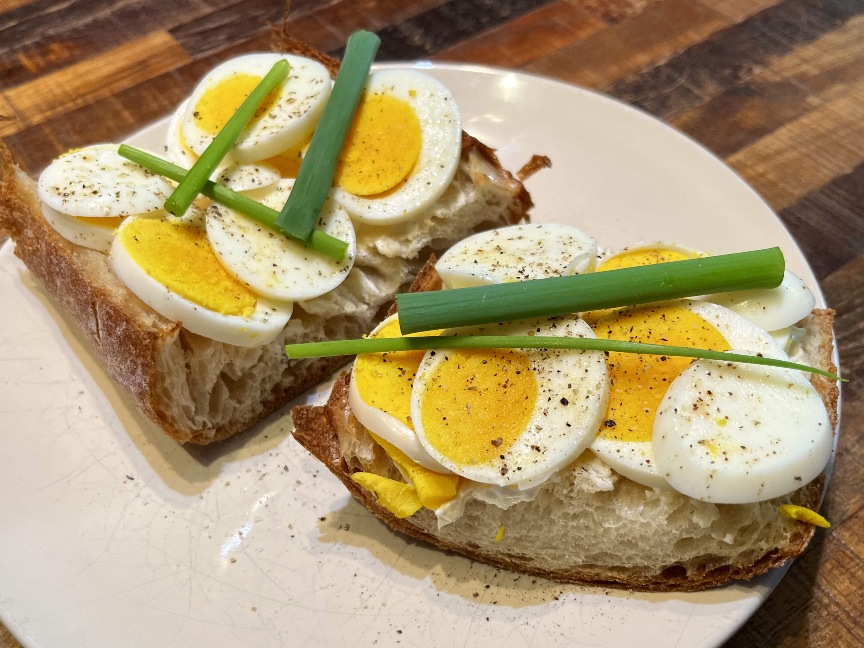 2 super-fresh HBEs from my buddy’s hens on local ciabatta from the loaf my friend who works at a bakery gifted me, local cream cheez, topped with Paddy O’ Scallions.