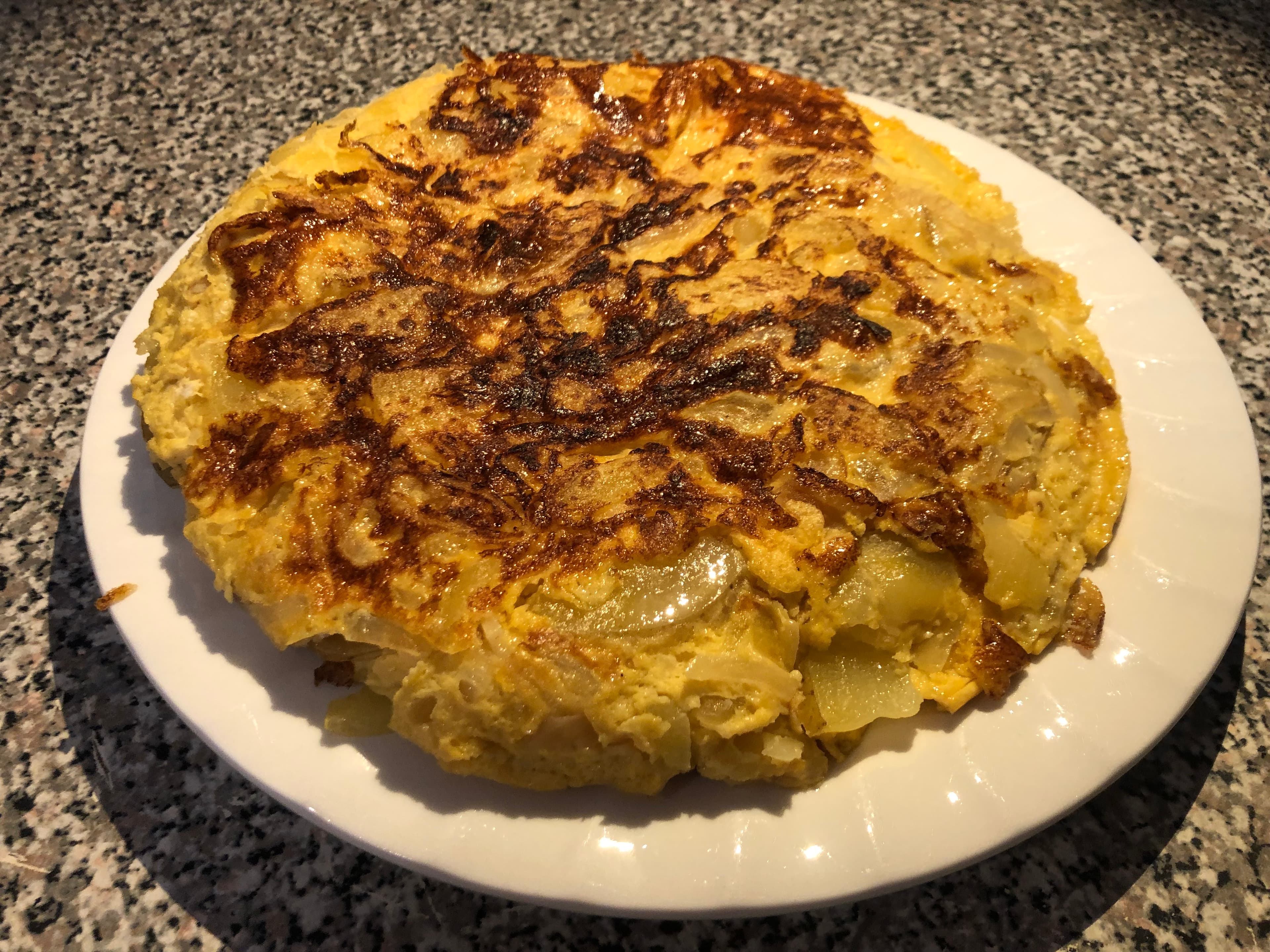 Tortilla Espanola, aka Spanish omelette. Took 3 tries to get it right after not making it for several years. Temp and duration were the issues. One big change from traditional is I used steamed potatoes instead of slow fry in olive oil. EV olive oil is getting pricey and I didn’t want that much leftover oil to use again. After steaming sliced potatoes, and sautéing onion, I combined both and cooked with olive oil. Then I combined in eggs and fried in a carbon steel pan about 6 mins each side. Yes the pan flip is a hassle. Not perfect, still a few tweaks like adding more salt and/or umami.