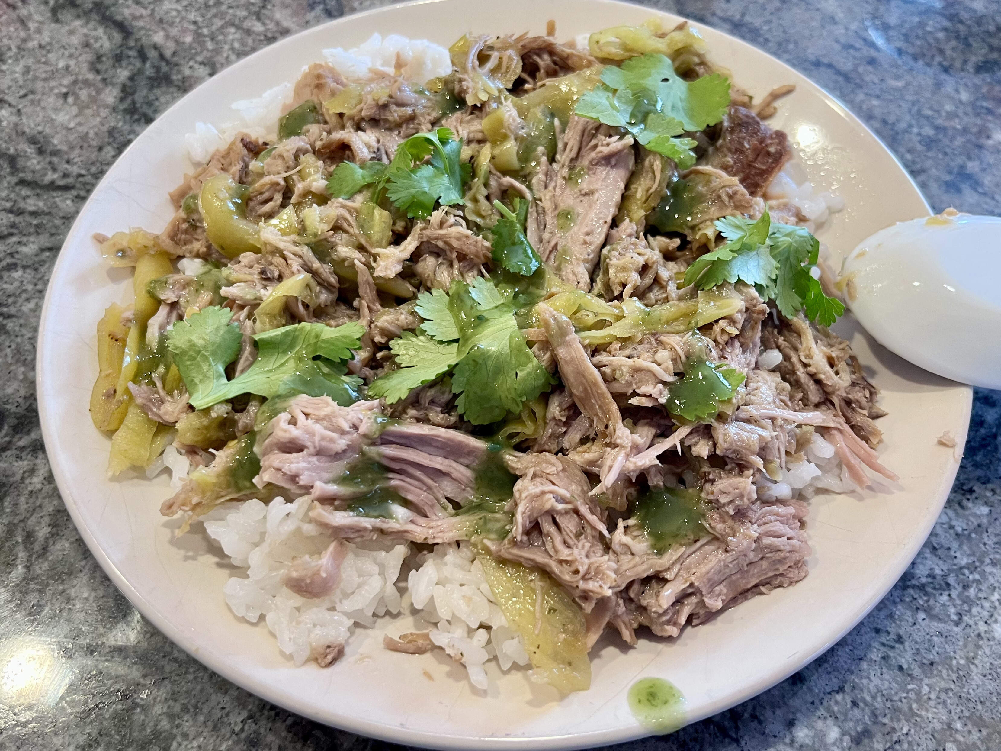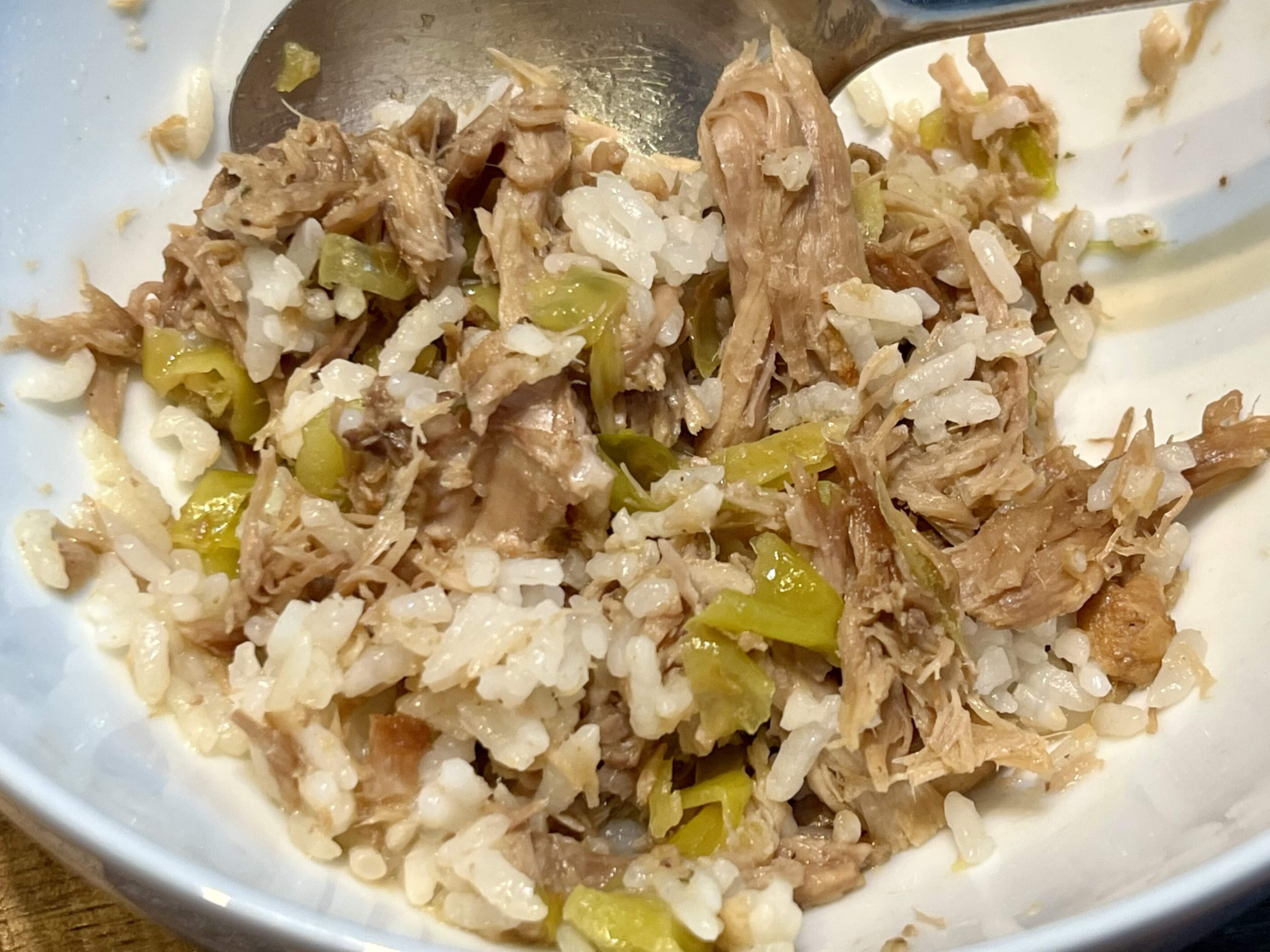 The pork that keeps on porking. Post-arm day piggy over steamed rice with extra pork jus, lime juice, El Yucateco, Sinatra ![]()