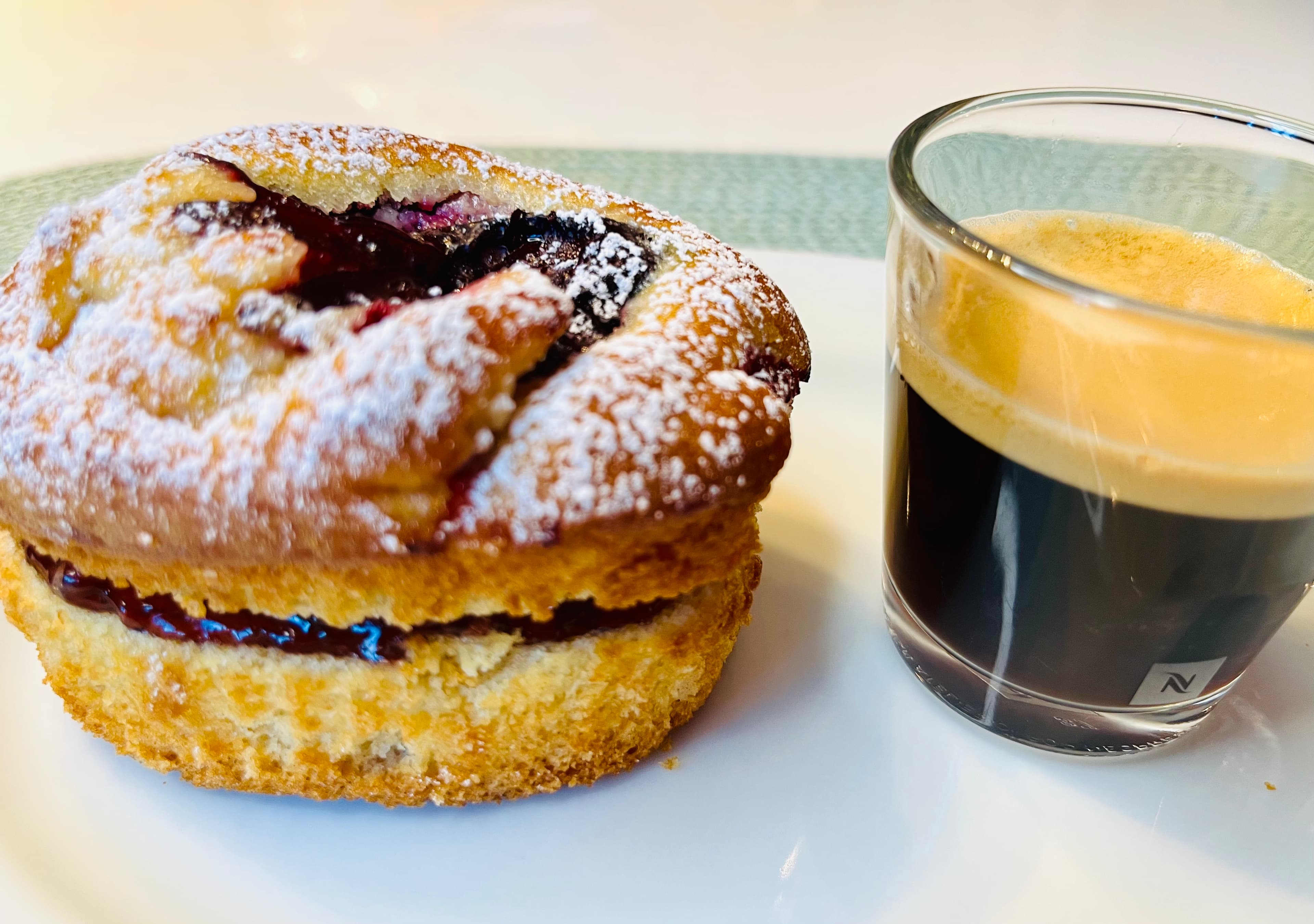 La meranda today is a spongey from the Asian Mkt. Fresh blackberries, blackberry coulis and dollops of sour cream gilded the lily; a double espresso followed.