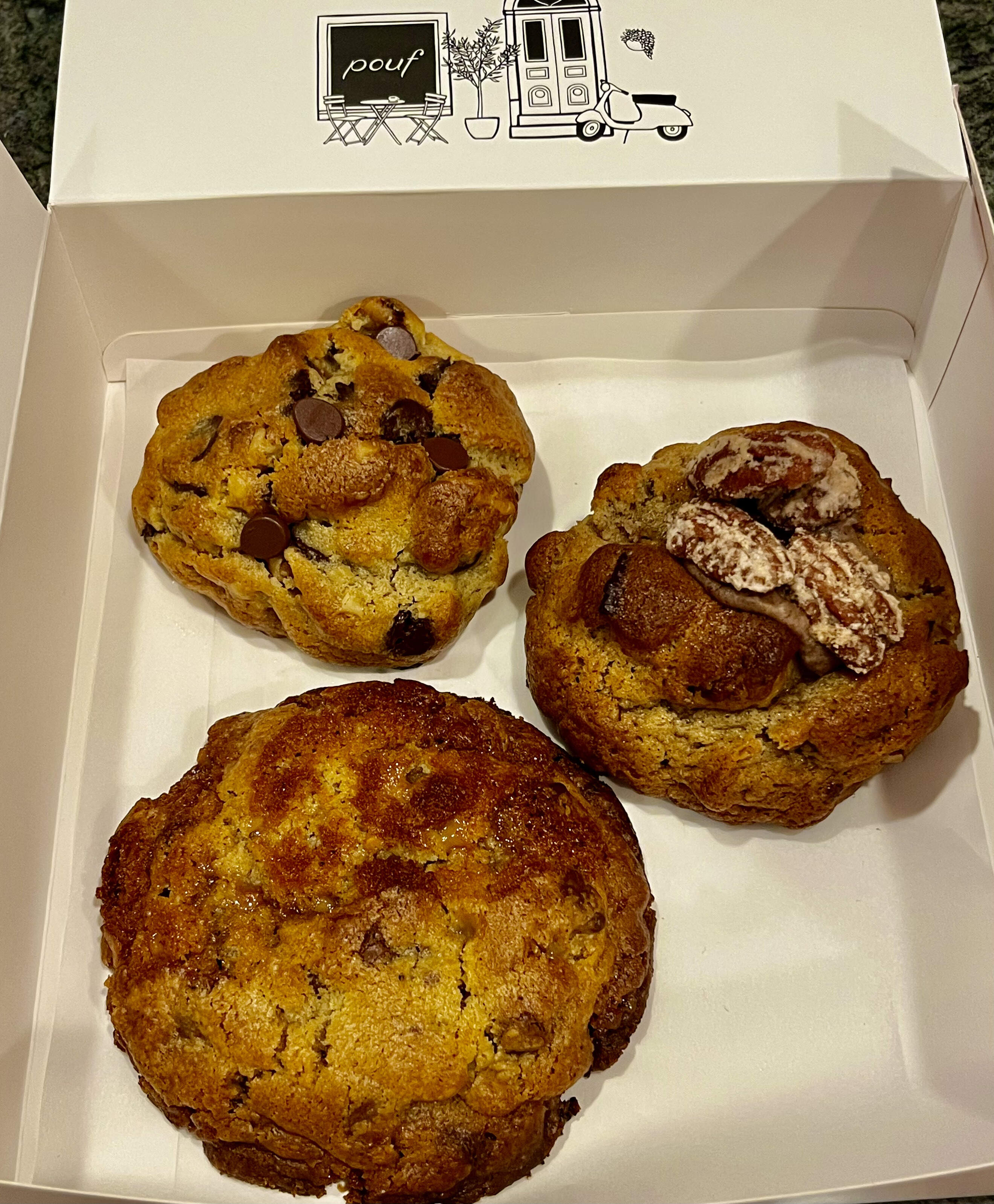 Clockwise from top left: CC walnut cookie, maple pecan cinnamon cookie, and her newest creation, a brown butter toffee cookie.